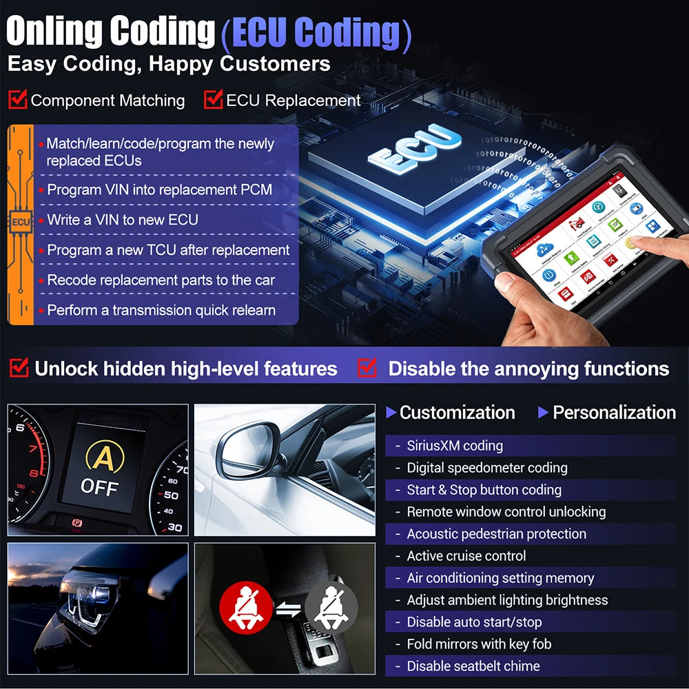 ECU diagnosis has always been an important part of high-end repair. The complexity of the ECU-coded data is often confusing. ECU coding involves matching, relearning, and modification to all the ECU modules, which can fix complex ECU issues. Compared with other diagnostic scanners, LAUNCH automotive scanner ECU coding functions feature more nature: larger vehicle coverage, no-fee function supports, higher diagnostic accuracy, more complete code data, accessible OEM data, etc.