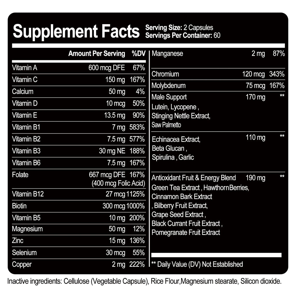 This dietary supplement contains an advanced multivitamin that helps boost energy and endurance levels, strengthen the nervous and immune systems, improve vision, increase antioxidant capacity, and enhance overall health and well-being for men.