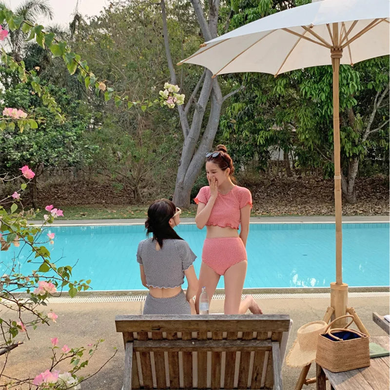 New Plaid High Waist Bikinis Two Piece Swimsuit Women Swimwear Short Sleeve Beach Wear Bathing Suits Korean Bikini Set Pool 2024