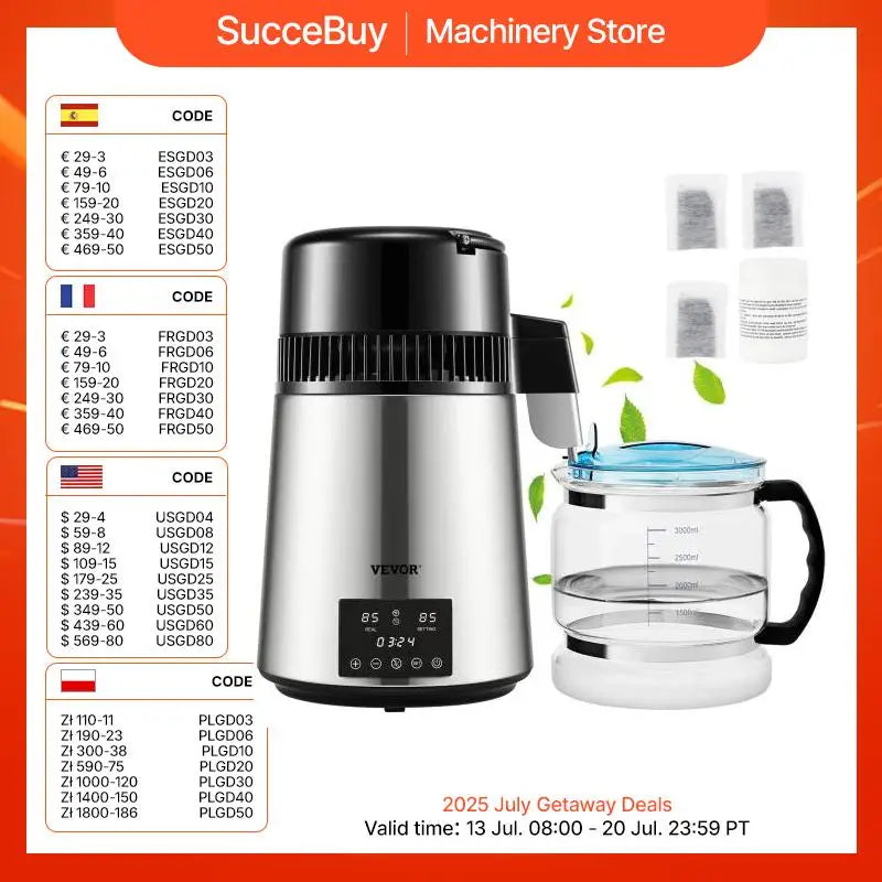 The SucceBuy 4L water distiller is designed to deliver purified water effortlessly, perfect for both home and office use. With its advanced panel, it ensures a steady supply of distilled water, efficiently removing VOCs and impurities. It processes up to 1 liter (0.26 gallons) per hour and features precise temperature and timing settings. Compact and space-saving, it’s an ideal choice for smaller kitchens.
