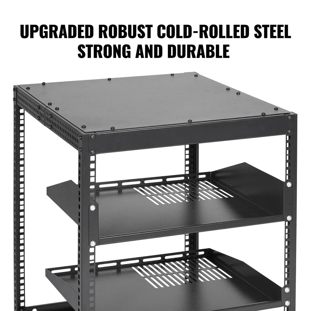 Constructed from durable carbon steel, this network rack boasts a robust load-bearing capacity, allowing for the secure placement of multiple devices.
