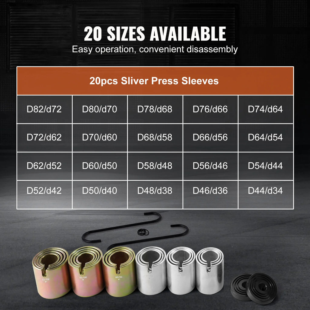 • 20 Sizes Available: Our bushing press and pull kit provides 20 different sleeve sizes to meet various repair needs, with a design focused on easy operation, ensuring a convenient and efficient disassembly process.