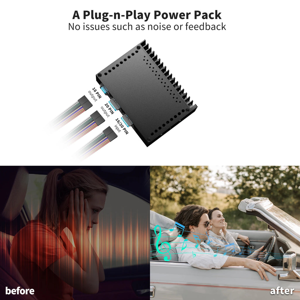 This 4-channel amplifier puts out Max 60W power and 47W RMS per channel when connected to four 4Ω-speakers(for most cars). It uses ATOTO’ s Dynamic Max Power Management (DMPM) technology to deliver a quick energy boost when need, virtually doubling the amplifier’s output power on musical peaks. It greatly boosts your audio experience by offering twice as much power as the original build-in amp.