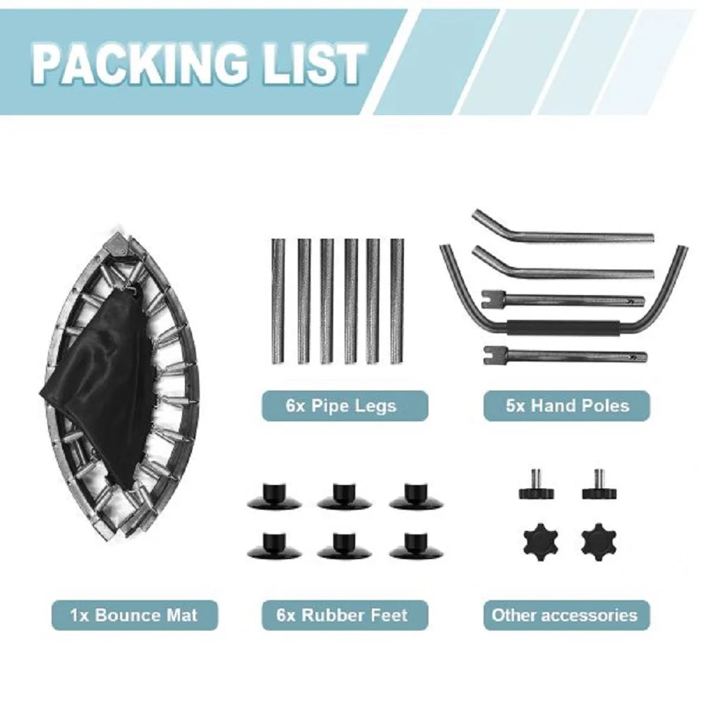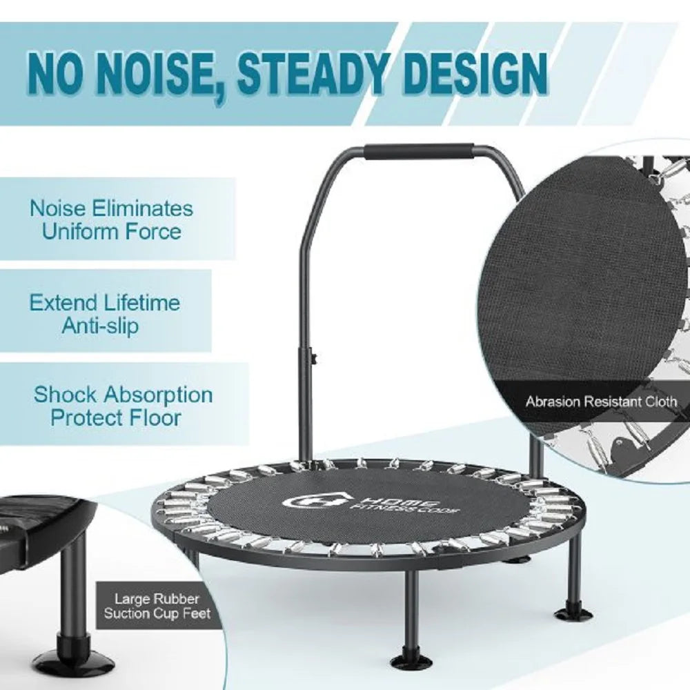 -- Max Load 150KG: The 40 inch mini trampolines is made of commercial high-quality steel material, non-slip adjustable handle, suction cups for the feet and resistant PP woven stretch fabric material which make the exercise trampoline more safe and durable to use, suitable for kids and adults.
