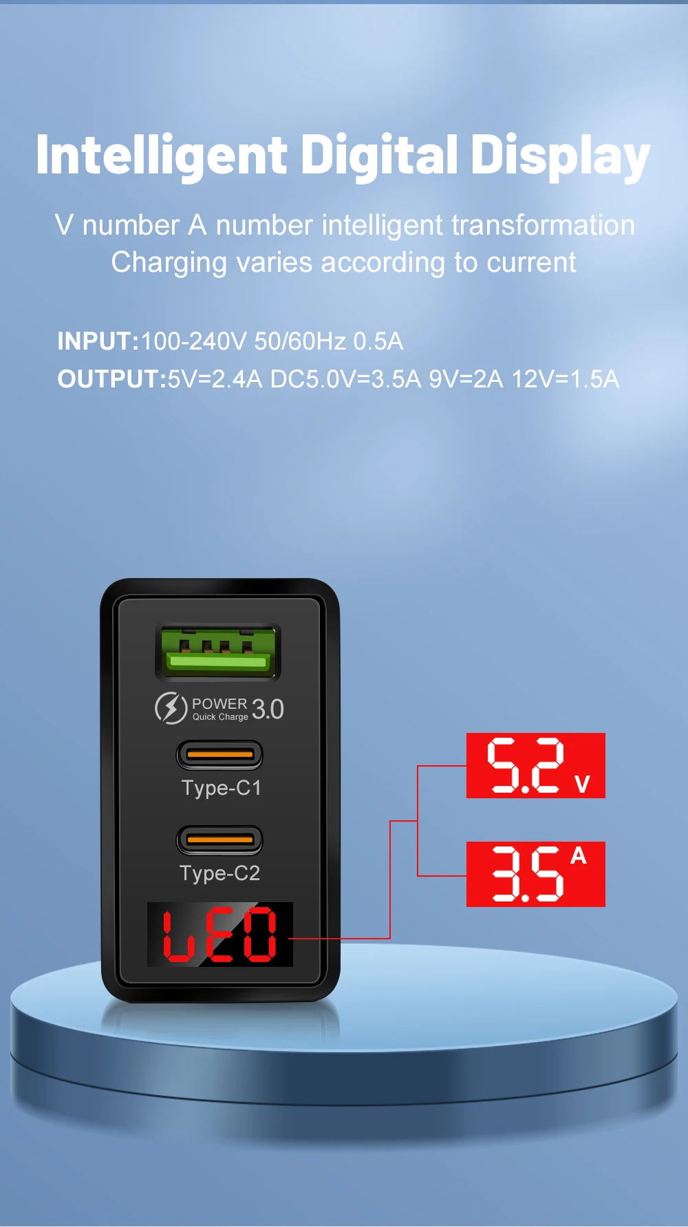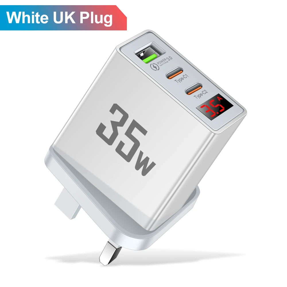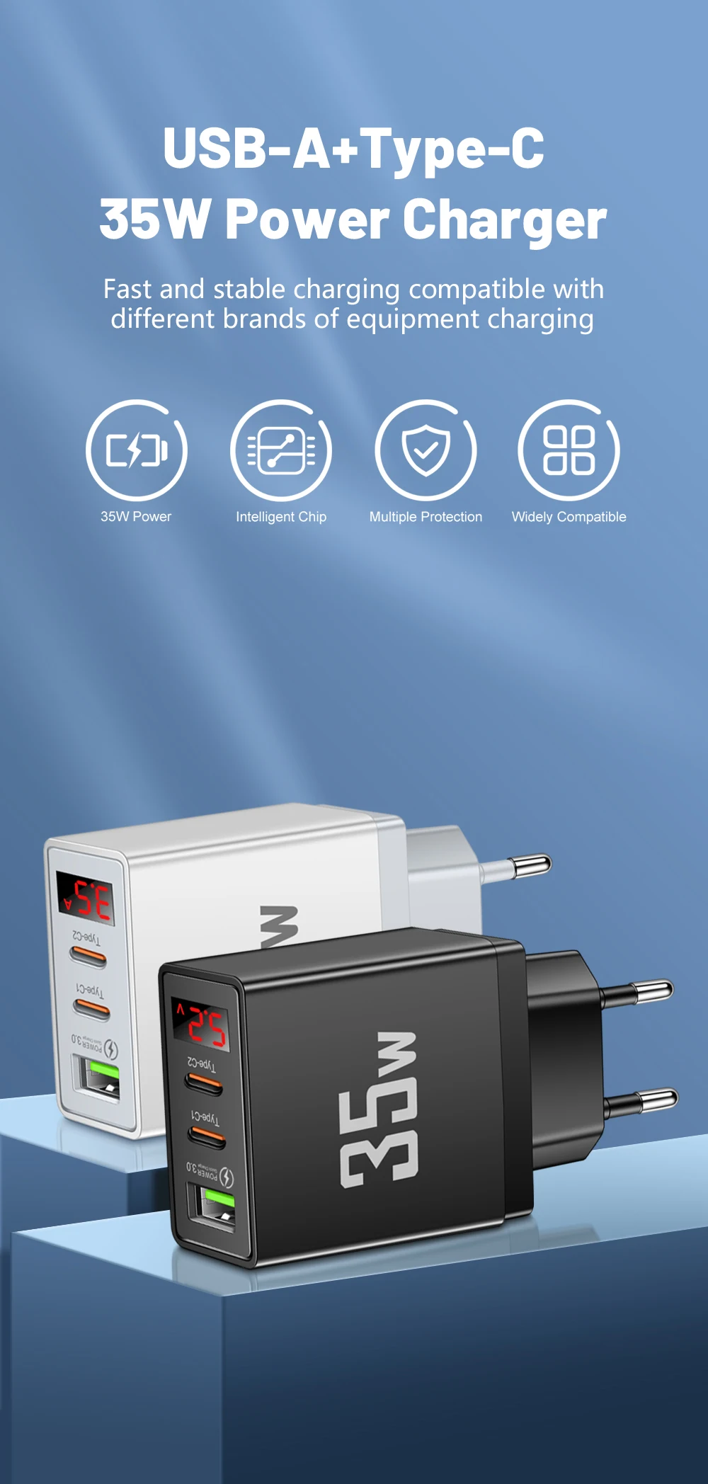 USB C Charger 3 Ports PD Fast Charging Digital Display Quick Charge 3.0 Phone Wall Adapter for iPhone 15 Xiaomi Samsung Huawei