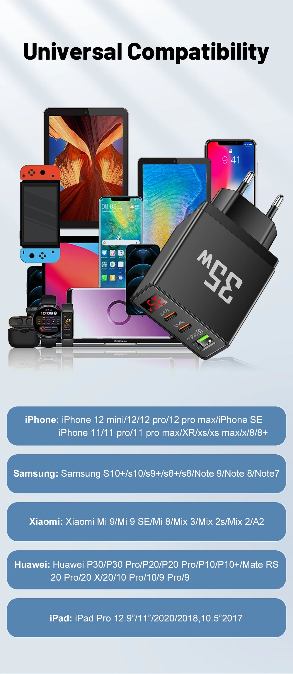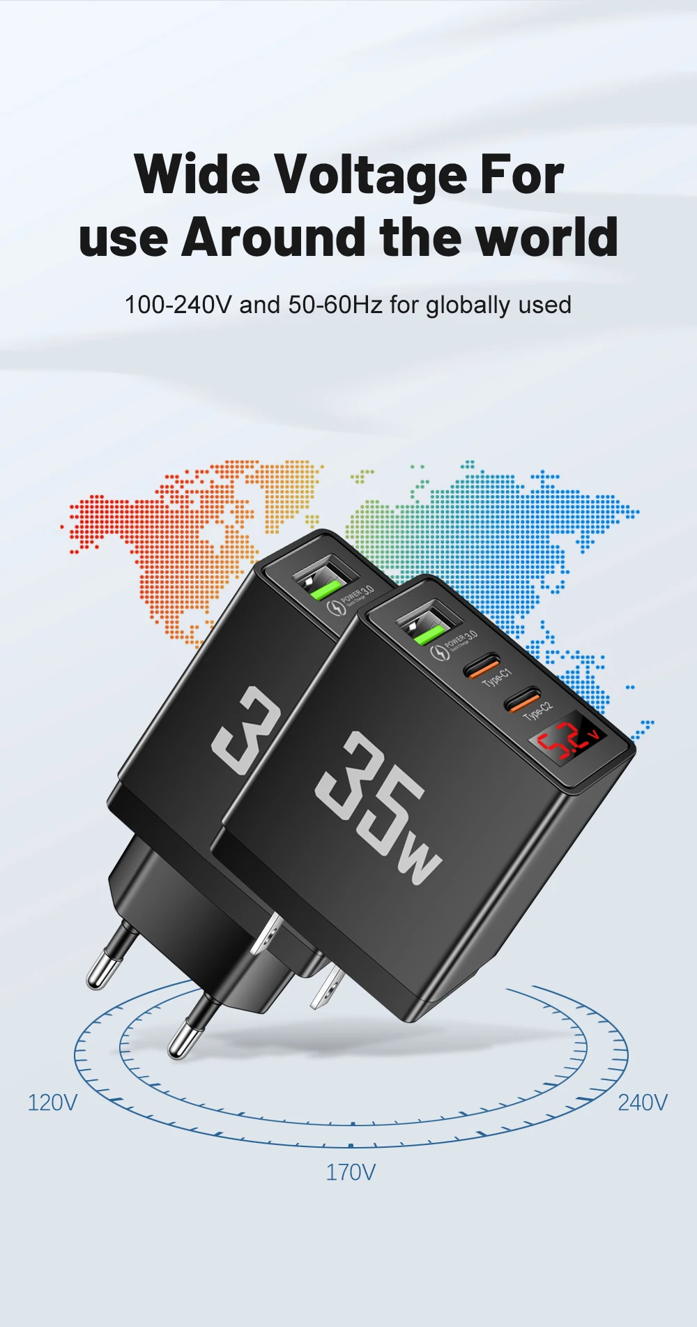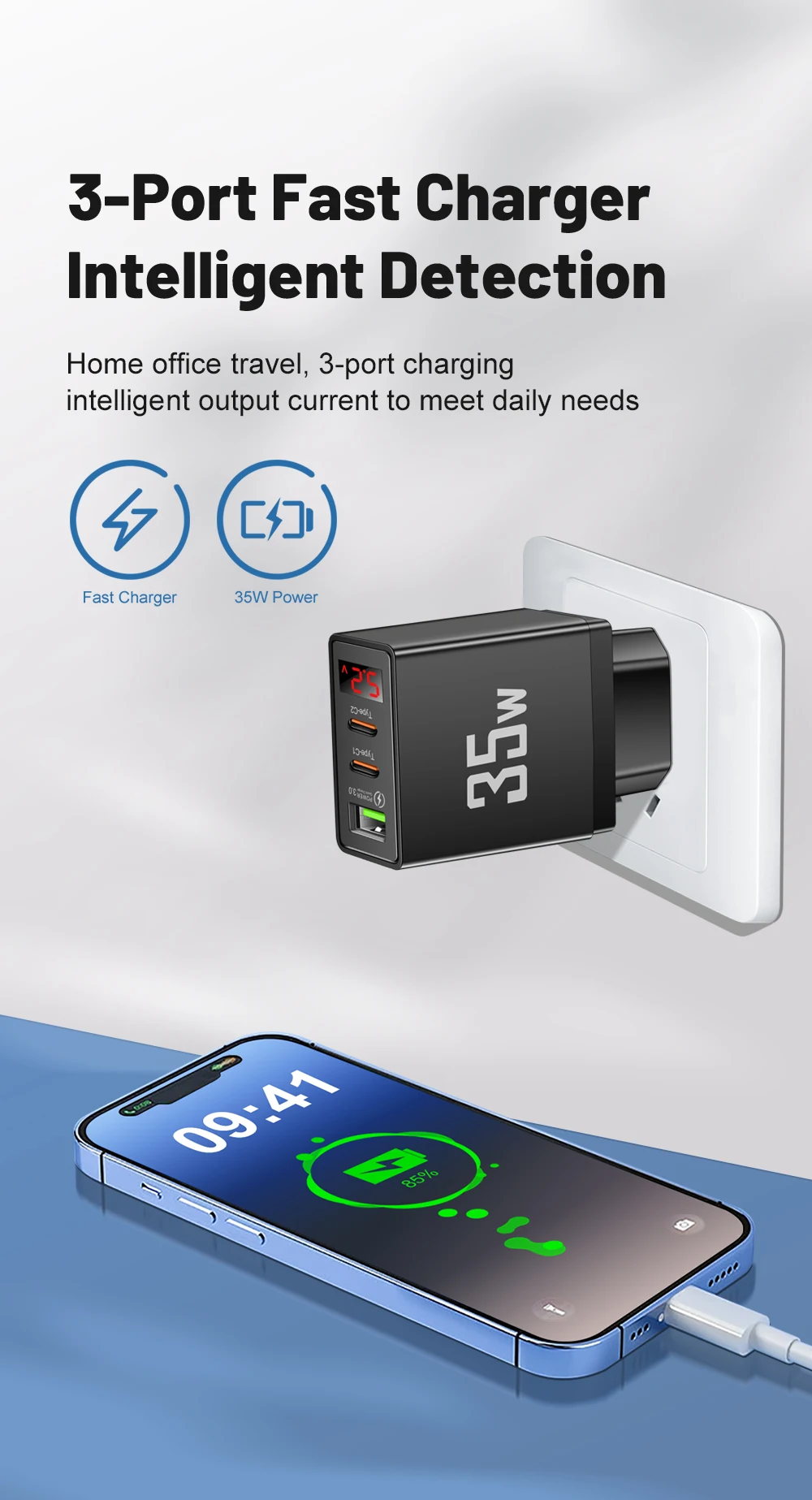 USB C Charger 3 Ports PD Fast Charging Digital Display Quick Charge 3.0 Phone Wall Adapter for iPhone 15 Xiaomi Samsung Huawei