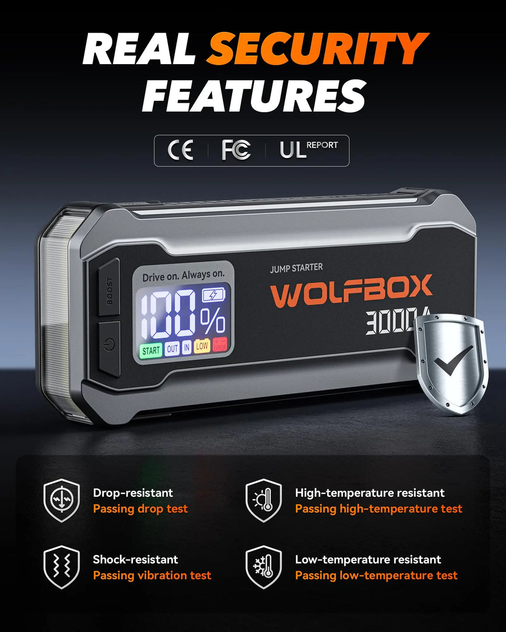 WOLFBOX 3000A Jump Starter,12V Car Battery Jump Starter,65W Quick Charge 16000mAh for 8L Gas 6L Diesel Engine with Booster