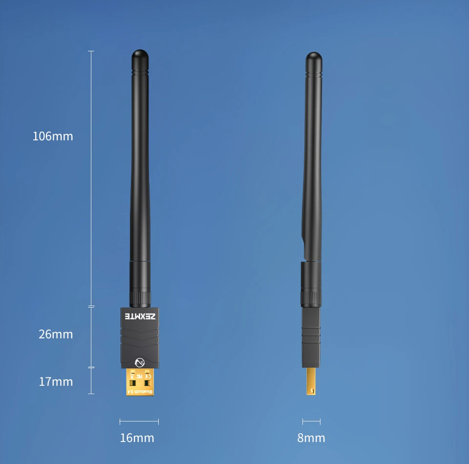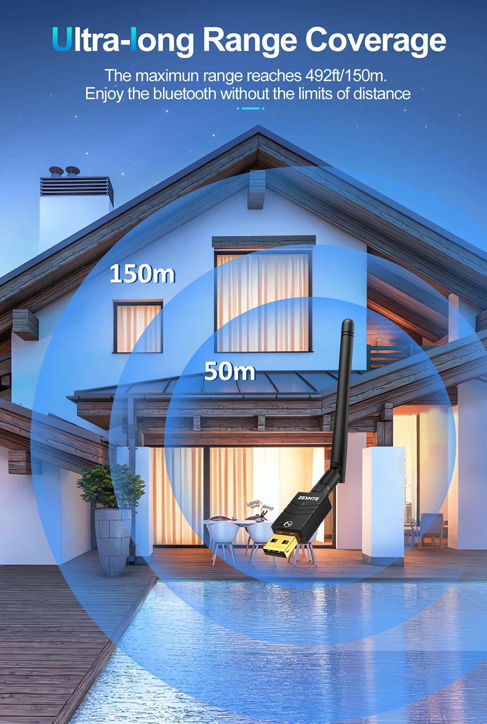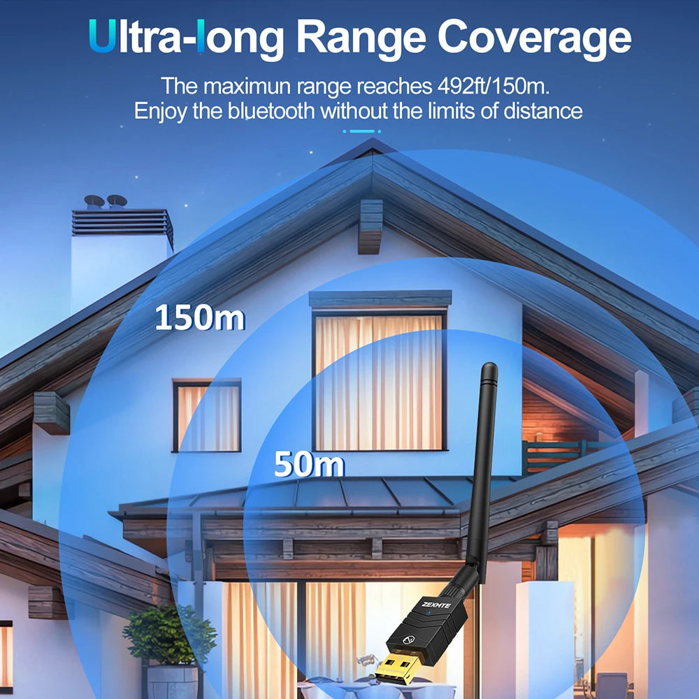 Equipped with extra long antenna, the maximun range reaches 492ft/150m. Enjoy the bluetooth without the limits of distance.