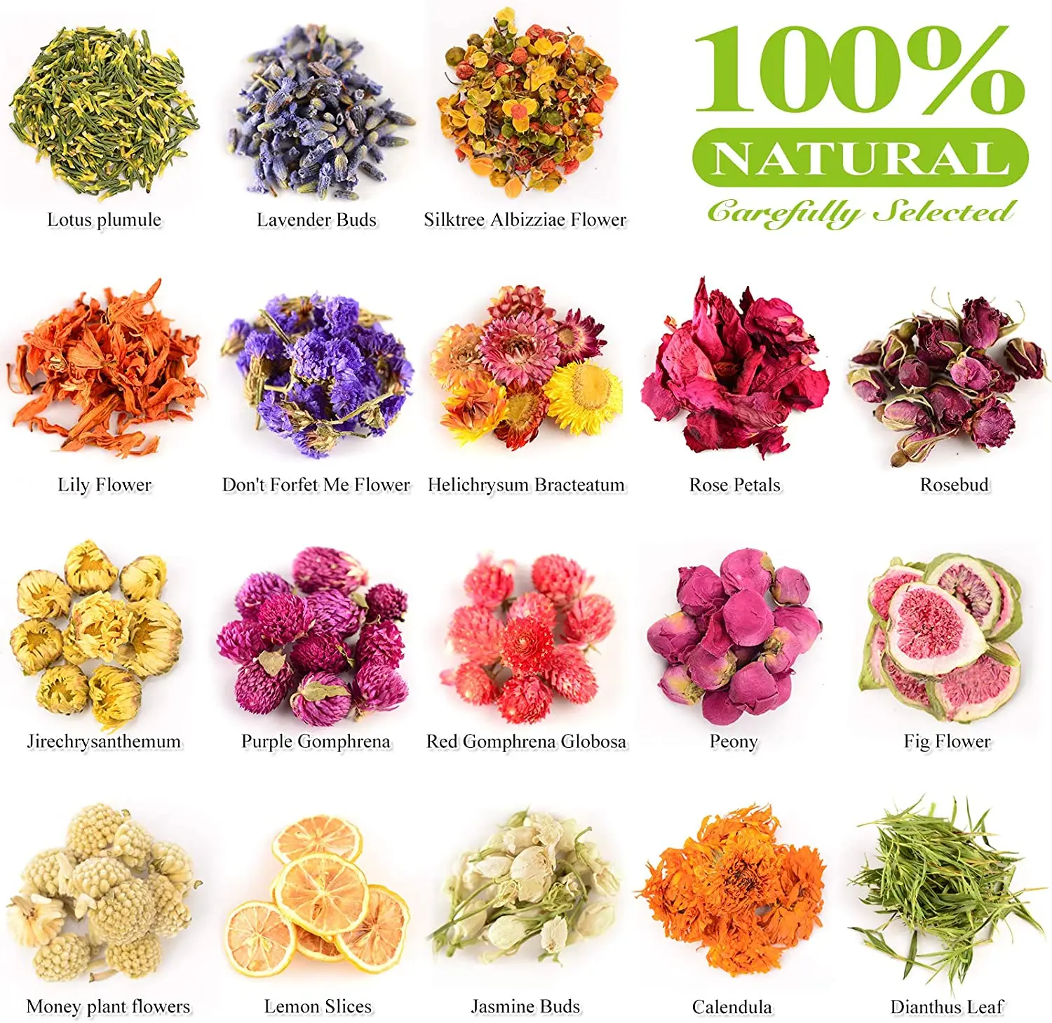 【 Dried Flowers 】Each dried flower has its special function and shape, this set will meet your different needs. You will get natural dried flowers: Lavender, Lily, Jasmine, Red Pearl, Rose Petal, Don't Forget Me Flower, Peony, Heliconia, Stand, Purple Gomphrena, Money Plant Flower, Lotus, Calendula, Fig Flower, Jirechrysanthemum, lemon slices, chrysanthemum leaves, silk tree albizia flowers, Kunlu snow chrysanthemum, roselle, stevia leaves!