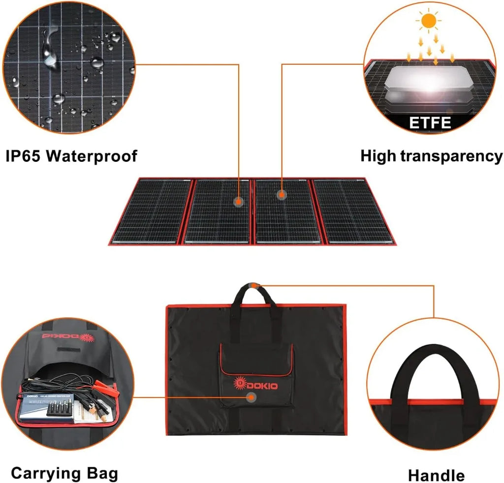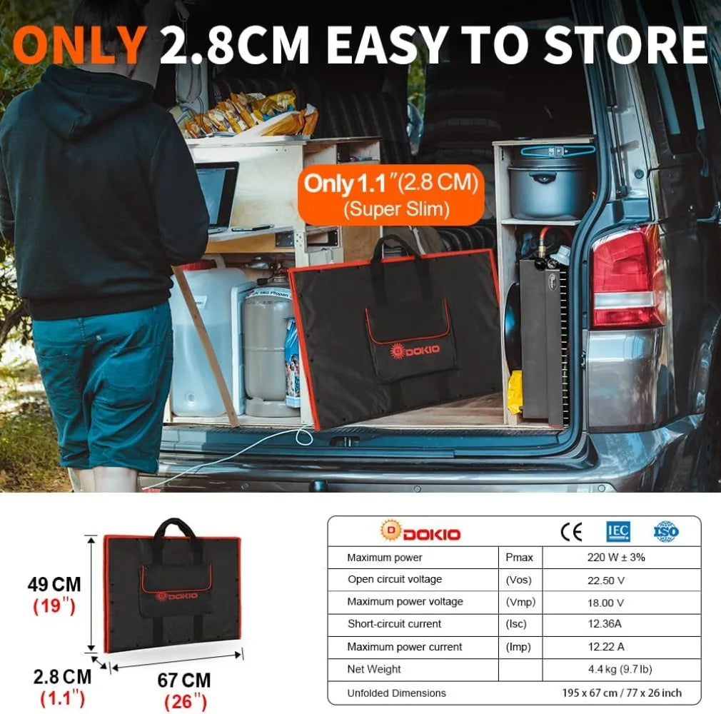 • 【LIGHTWEIGHT AND ULTRA-THIN FOR EASIER MOVING】-- This solar panel packs 220W of power yet is only 1.1inch (2.8cm) thick and weighs only 11.7lb(5.3kg),Foldable Dimension:29*21*1.1inch (73*54*2.8cm), making it easier to transport, hang, and remove.
