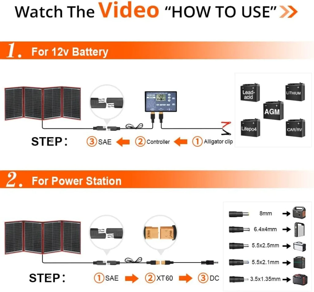 • 【PERFECT CHOICE FOR OUTDOOR AND EMERGENCY LIFE】-- 9.85ft (3m) cable length from panel to controller, For most power stations (Jackery,Goal Zero,Ecoflow,Paxcess) and 12-volt batteries(AGM,LiFePo4,Deep cycle batteries),RV,car,boat,trailer,truck,pumpa,camping,van,emergency power