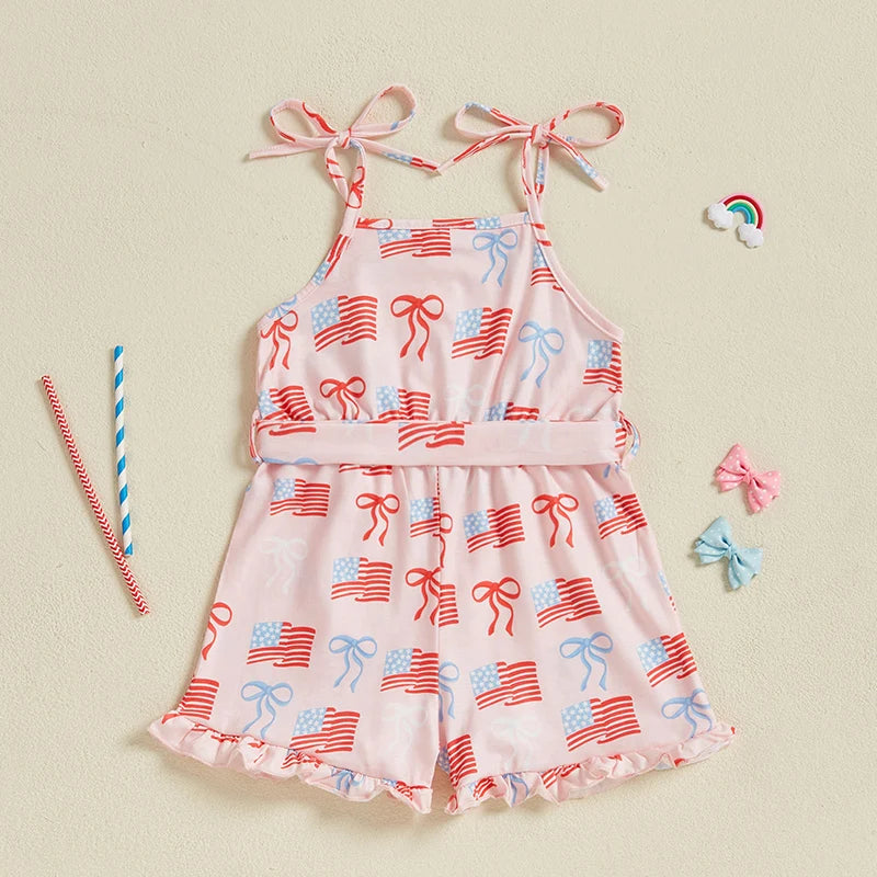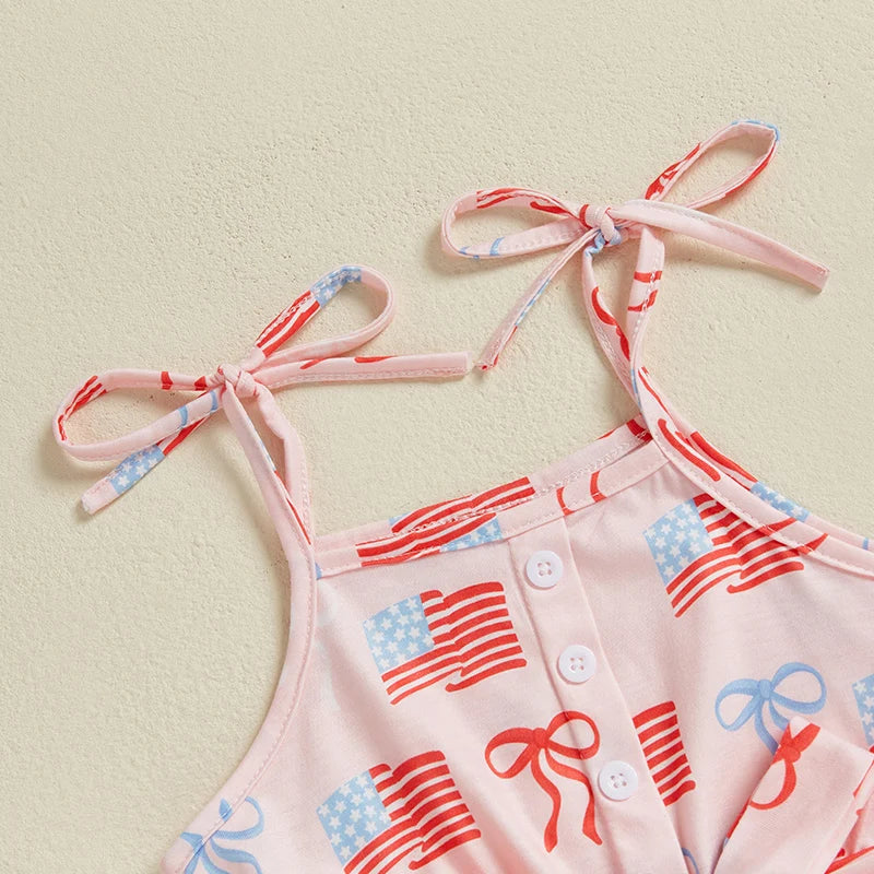 Baby Toddler Girl 4th of July Outfit Loose Fit American Flag Bow Print Sleeveless Spaghetti Straps Jumpsuit with Belt 2 Pcs Set for Summer