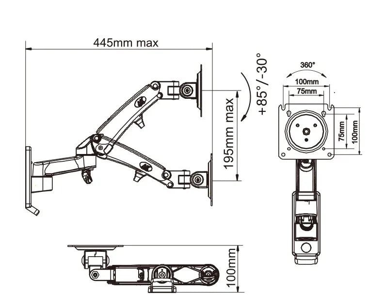 F300 is a wall mounted full motion LED, LCD TV or display mount. It is designed and built with concepts to enhance your viewing and gaming experiences. Constructed in aluminum alloy and built in durable gas spring cylinder, tilt, swivel and height can be position as wish for maximum comfort. Added unique pivot joints design offered 180° swivel and effortless tilting positions to eliminate gray viewing angles. Whether for entertainment, video conference, gaming or real time exercising with your idol, F300 is almost covered up every viewing spots in your room due to its versatility design. Product constructed in aluminum alloy and joined by riveting process produced a sturdy and stable universal TV mount. F300 is designed in single-arm double extension and fit most 30” – 40” TVs. Casted in a smooth arc shape with a perfect powder coated black product blends well with TV or display, ring and hood integrated cable management for a clean and clutter look.
