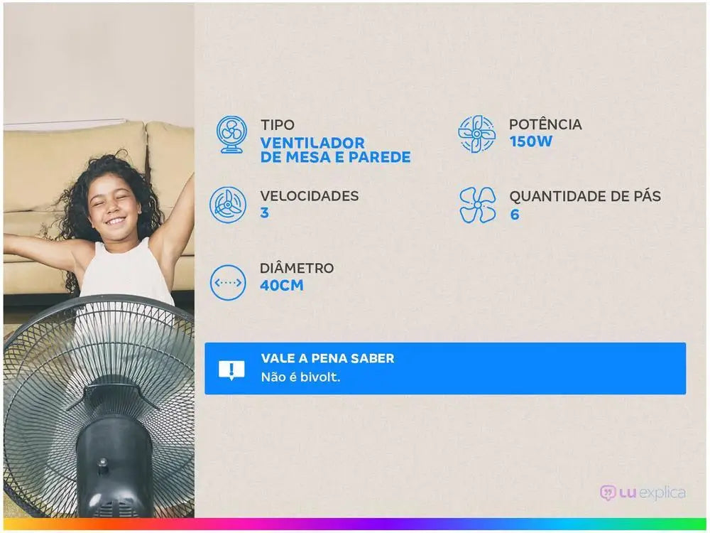 A practical option, portable and more economical to send away the heat is the Fan, is not it? If you're thinking of buying a new one, look at this Table Fan from Britannia. The Britania BVT400 Fan is a great choice to refresh with several functions for your well-being! There are 3 speeds that suit your needs, choose between the options soft, moderate and intense. The power of 150W, the propeller with new shape and Maxx Force Technology, 6-blade propeller with 40 cm, perform with higher air flow and ventilation capacity. The flexibility of the Britânia BVT400 fan provides 3 vertical tilt options and a button that triggers the automatic horizontal oscillation. 2 in 1, enjoy all this versatility and use the fan on the table, under countertops or as a Wall fan. Safety is not a problem, the motor with thermal fuse stops the operation of the product if there is overheating, in addition to the latching system of the grids. All this with low power consumption at any speed, thanks to its energy rating A. The Fan Britânia BVT400 Technology Maxx Force 150W makes all the difference to soften the heat providing comfort and freshness!
