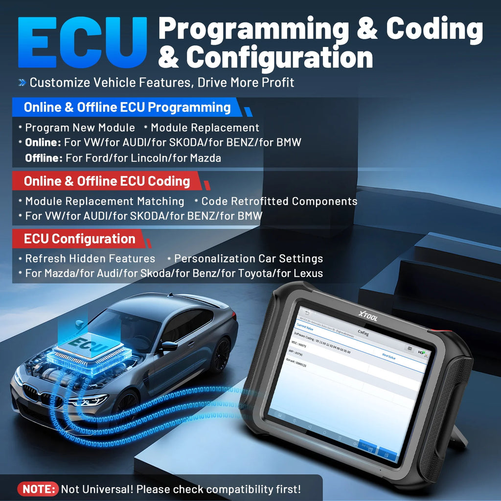 XTOOL X100MAX diagnostic scan tool can perform Online ECU Programming on BMW, Mercedes Benz, Volkswagen, Offline ECU Programming on Ford, Lincoln, Mazda and ECU Coding on Volkswagen, Audi, Skoda and etc to program/reflash ECUs, perform Online Calibrations, Online Parameterizations, and customize car settings.