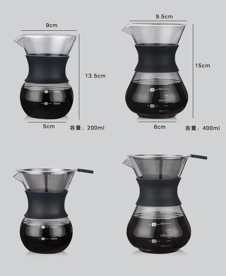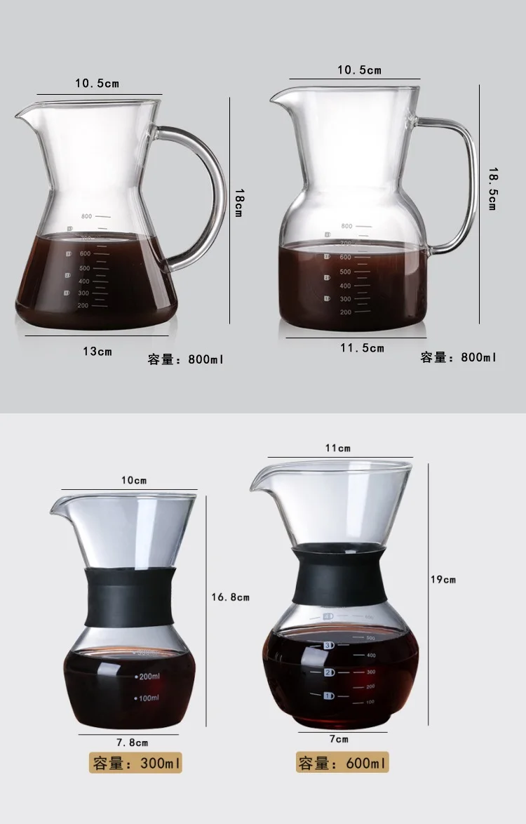 Venta al por mayor, cafetera de vidrio resistente a altas temperaturas, cafetera Espresso, cafetera con filtro de acero inoxidable Características principales: -Hecho de vidrio resistente al calor de alto borosilicato, no necesita papel de filtro, duradero y reciclable. -Cuando utilizas la red de filtro para filtrar el café, el flujo de agua es estable, te permite disfrutar de tu momento de hacer café. -Grifo Tipo V, agua suave, sin goteo, simple y fácil de usar. -Con la línea de escala en la botella, diseño considerado, permite que captes fácilmente la capacidad que necesitas. -Capacidad: 1000 ml Peso del paquete: aproximadamente 0,65 kg Contenido del paquete: 1 taza para hacer caféDescribe the product sizes, including different SKUs different sizes.