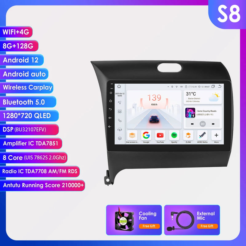 -----> Basic functions: Android 12 + 9 inch / 10.33 inch Display Screen + Quad Core 1.2GHZ (Eight core UIS 7862A 1.8Ghz / UIS 7862S 2.0Hhz optional)+ DDR3 1GB Flash (2GB/3GB/4GB/6GB/8GB optional) + 16 GB Memory (32GB/64GB/128GB optional) + WIFI (4G Network optional)+ Mirror link+ Steering Wheel Control + RDS+DSP(optional)