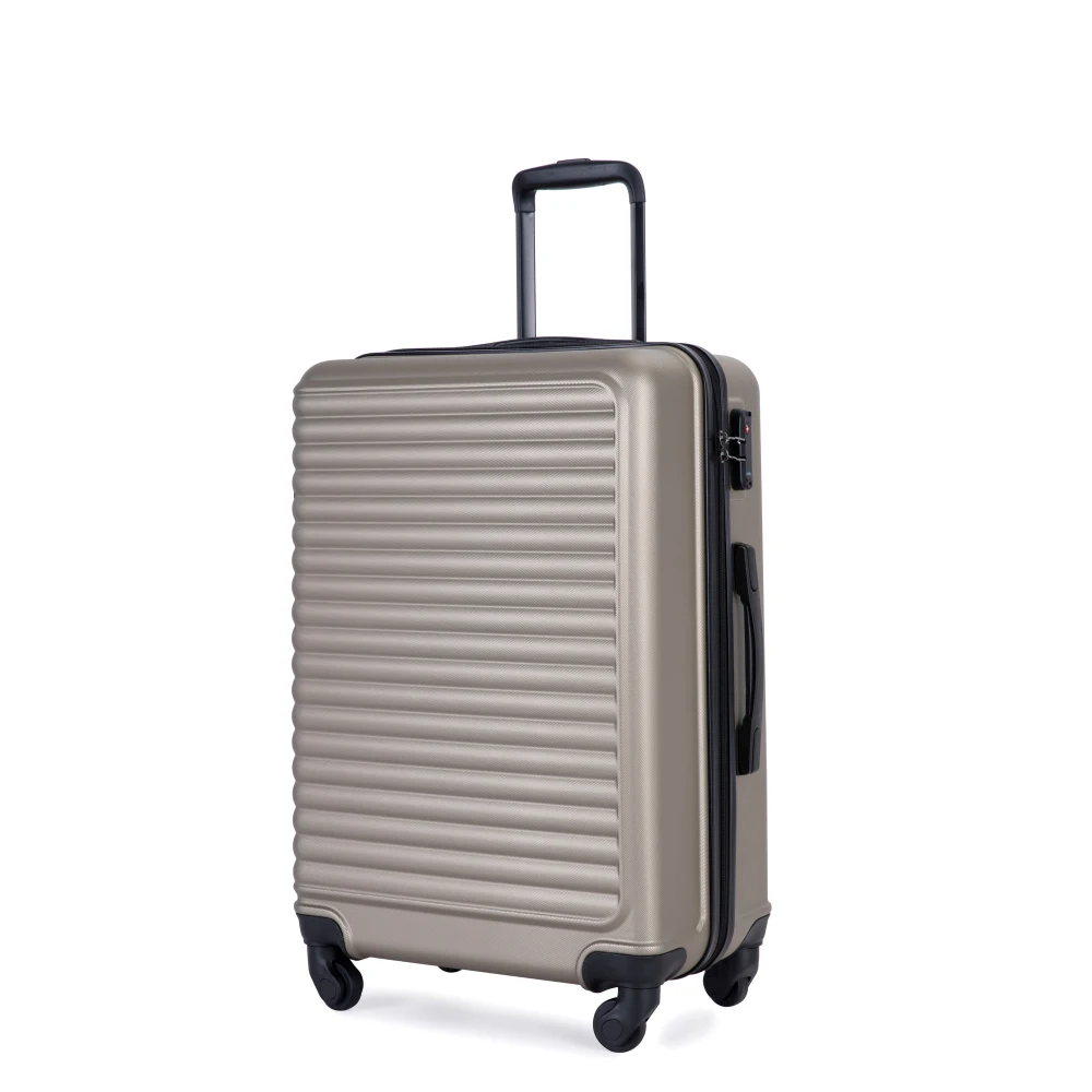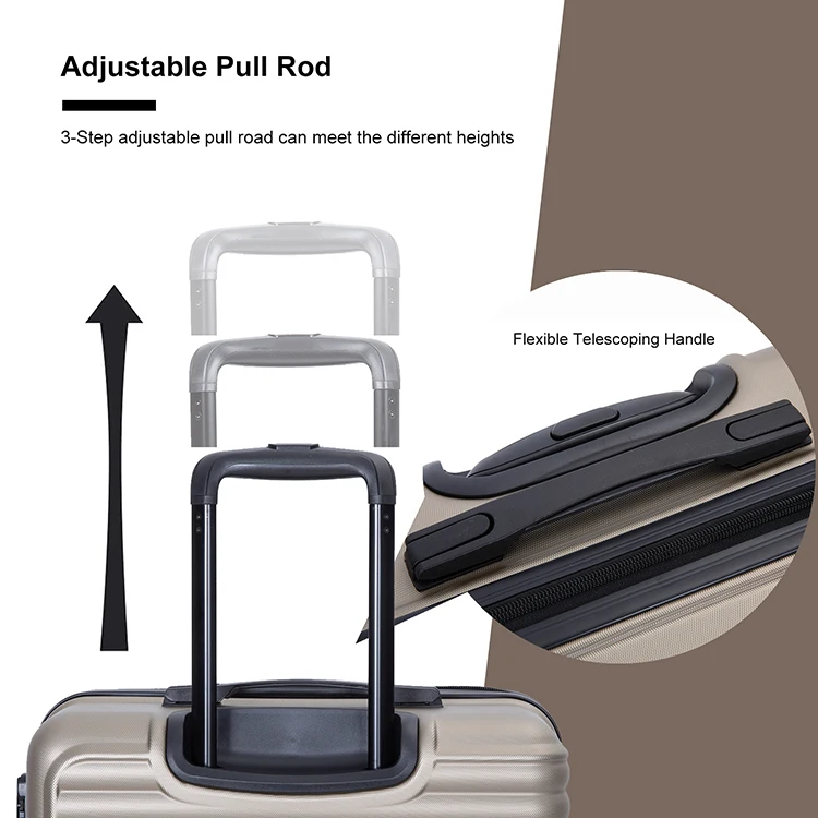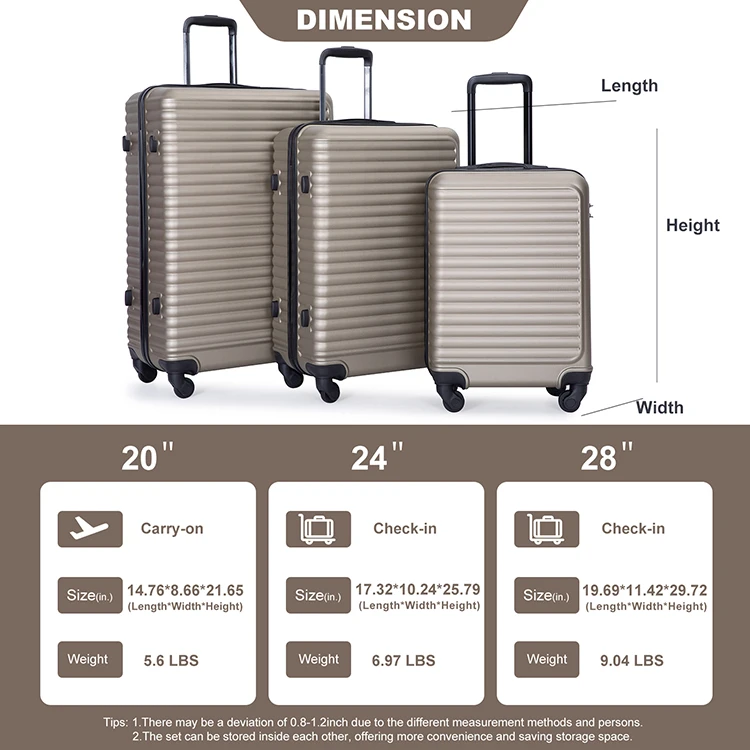 Material: 100%ABS Extremely lightweight and durable. 3pcs Luggage Set 20" is carry-on, 24" and 28" are check-in.They can be stored inside each other, offering more convenience and saving storage space.