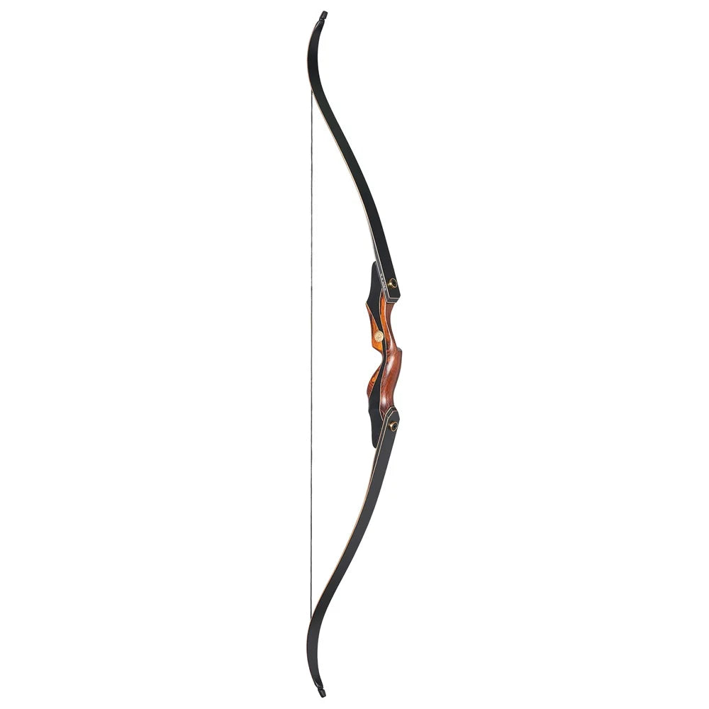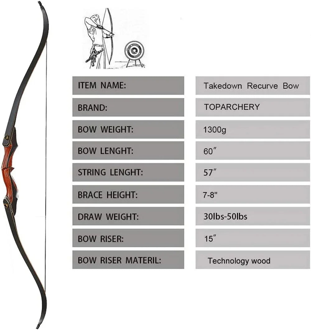 This is a 60" laminated takedown recurve bow. The limbs are laminated by bamboo, wood, and fiberglass sheets. Bamboo is good for its strength and elasticity. The limb is a wood core surrounded by fiberglass and bamboo. The limb tips are reinforced to accept bowstrings for draw weight of up to 50 lbs. This is a recurve model, not a longbow model. We have separate limbs available to upgrade/downgrade your draw weight quickly.