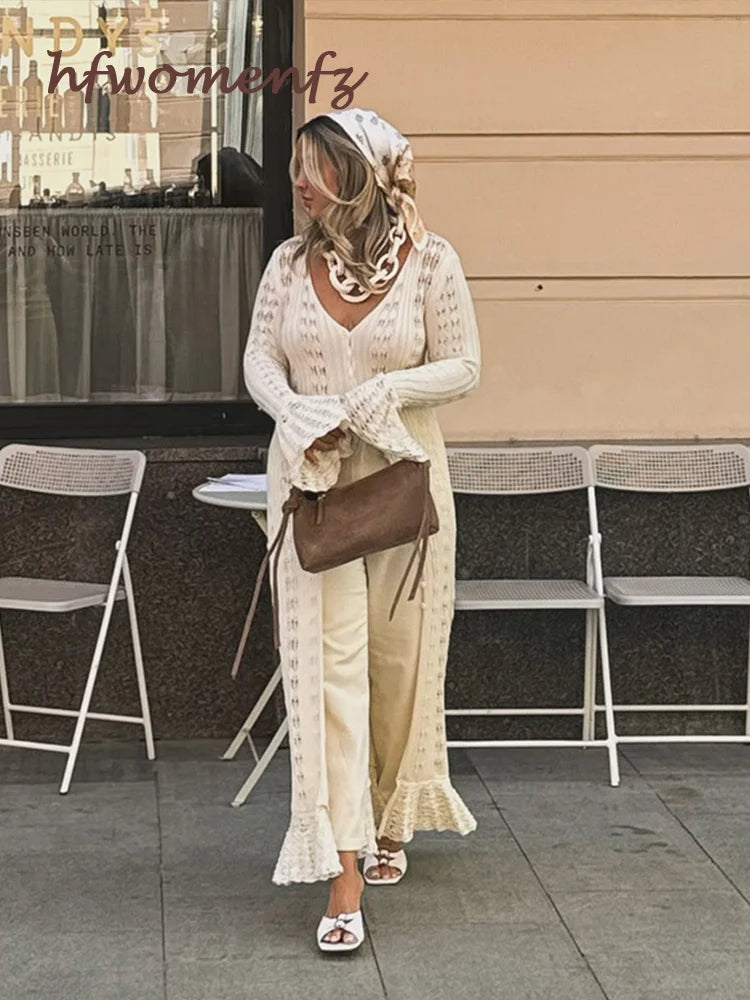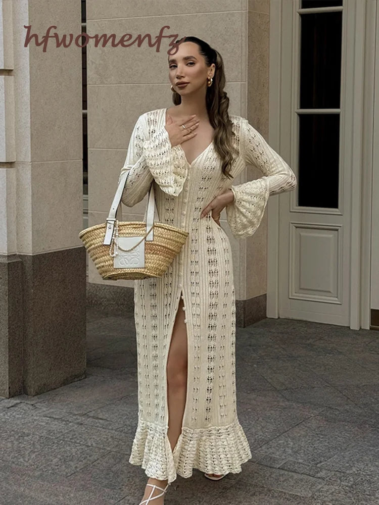 Elegant Knitted Hollow Out Long Dress Women Beach Ruffle Single-breasted Flare Sleeve Cardigan Robe Female Fashion Solid Dresses