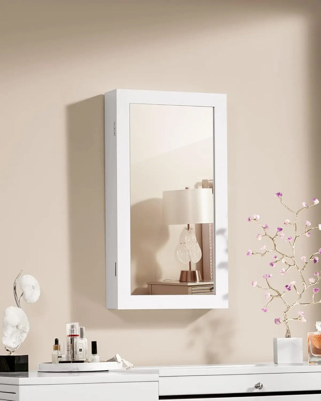 SONGMICS special jewelry cabinet with diversifying use must meet your different needs. With the generous and elegant looking, it is perfect to put in bedroom or dressing room. With 2 interlayers, 65 ring frames, 64 earring hooks, 24 earring jack studs, 24 necklace hooks, it has large capacity to orderly store your items. Safety guarantee with side door lock and 2 keys. So Songmics white wall/door-mount mirrored jewelry cabinet is an ideal for your to organize your jewelry and beauty items.