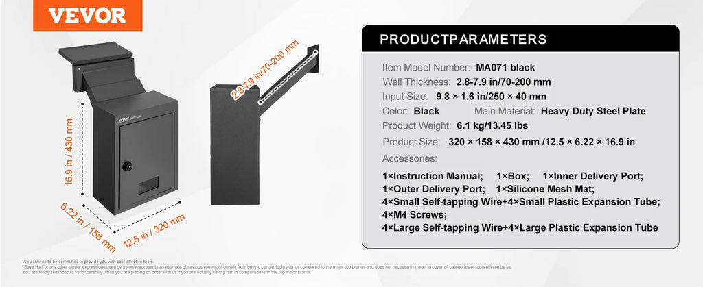 • Colour: dark grey, Product size: 320 x 158 x 430 mm / 12.6 x 6.22 x 16.9 inches, Input size: 9.8 × 1.6 inches / 250 × 40 mm, Wall thickness: 2.8 to 7.9 inches/70 to 200 mm, Item model number: MA071 Dark Grey, Main material: sturdy steel plate, Product weight: 6.1 kg / 13.45 lbs