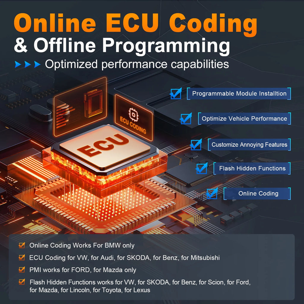 ECU coding capability for VW/AUDI/SKODA ONLY which performs online Coding, Component Matching, Adaptive Data Reset, Flash Hidden Functions, etc. to optimize vehicle performance and customize car settings.