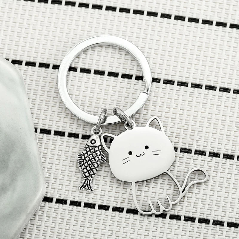 Funny Cartoon Cat Fish Keychain Couple Lovers Stainless Steel Keyring Lovely Pendant Key Chain Valentine's Day Gift Jewelry