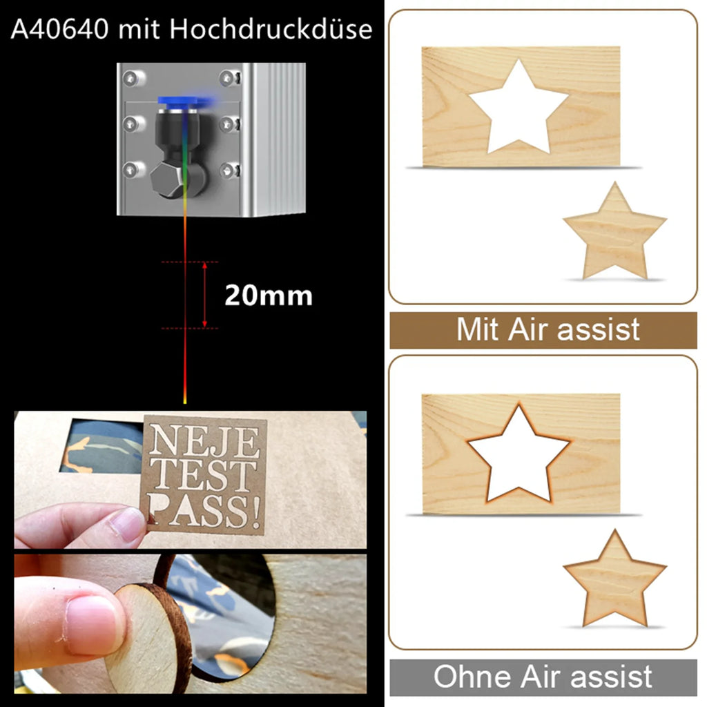 The laser engraver is equipped with an air-assist system that generates a strong and stable airflow when engraving wood and metal, effectively removing smoke and debris generated during the work. This not only improves the efficiency of the laser, but also dramatically reduces the processing time, allowing you to do more work with less effort.