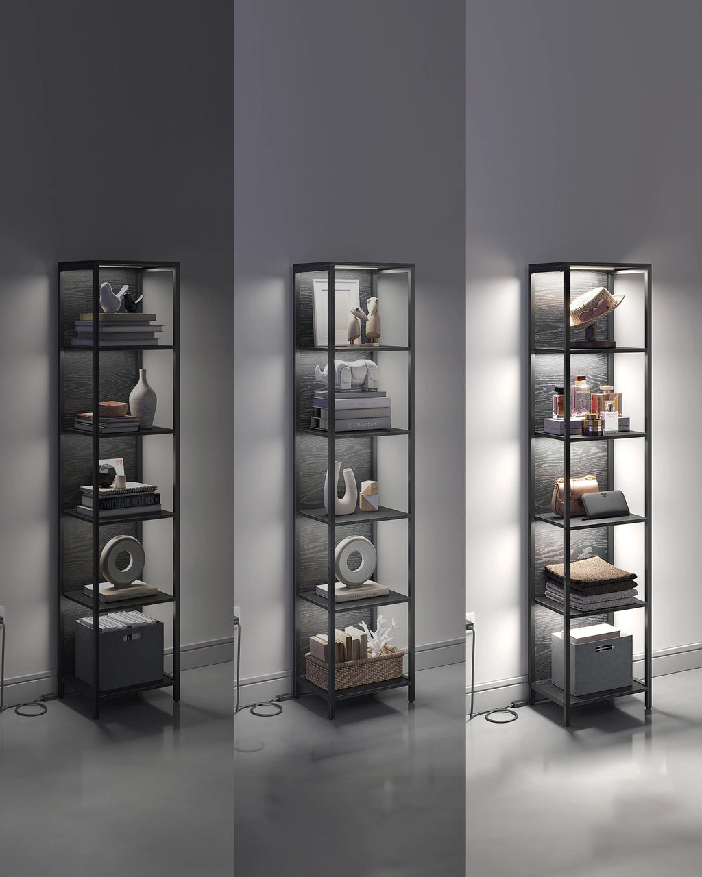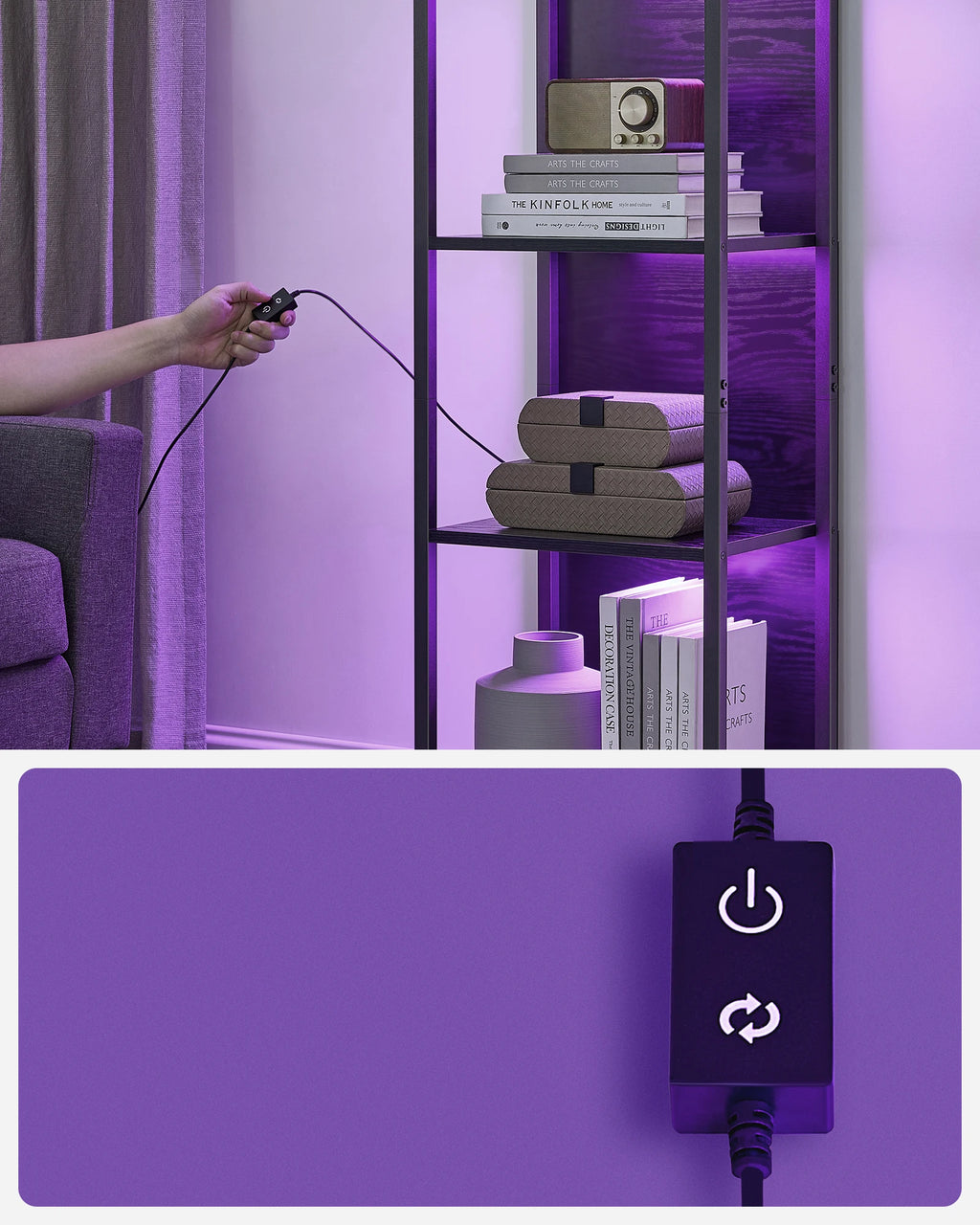 FILE ADJUSTABLE LED LIGHTENDITIONBBThis bookcase has LED lights with 25 colors, 6 brightness levels, 10 flashing modes and 6 flashing speeds, as well as a supplied remote control to create a unique atmosphere