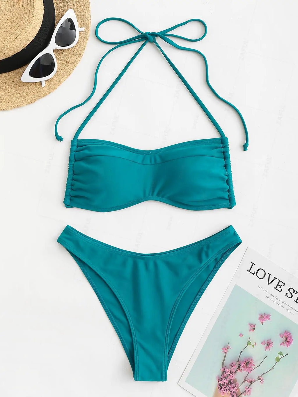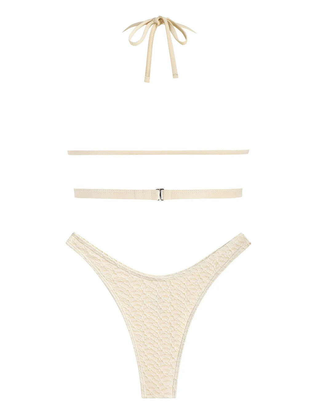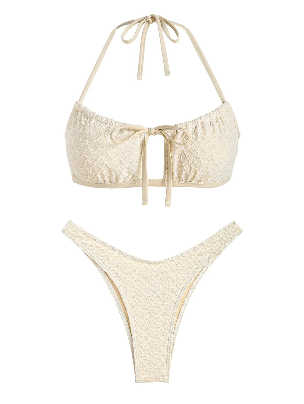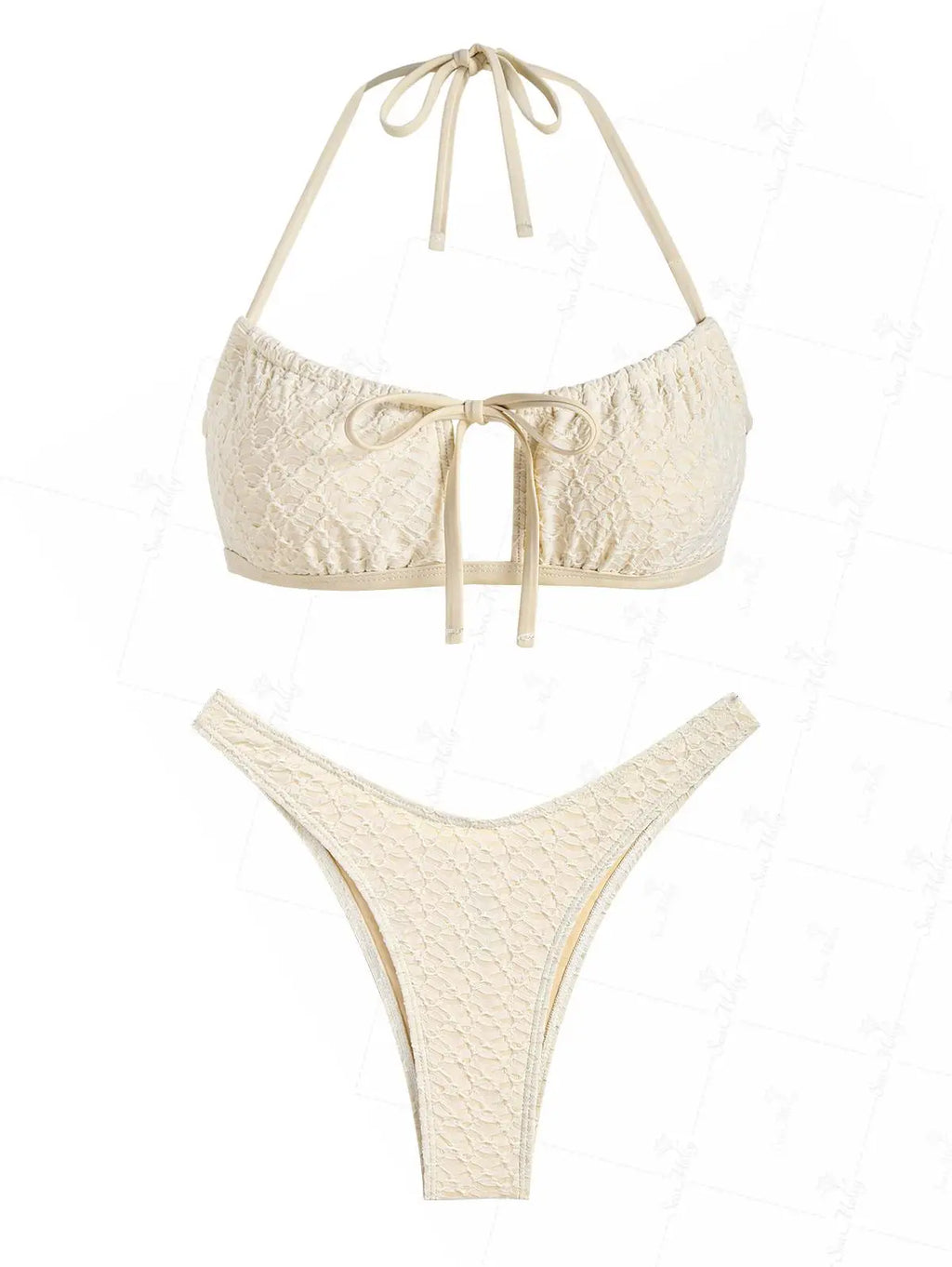 ZAFUL Women's Lace Overlay Halter Tied Cheeky High Leg Brazilian Two Piece Swimwear Bikini Set