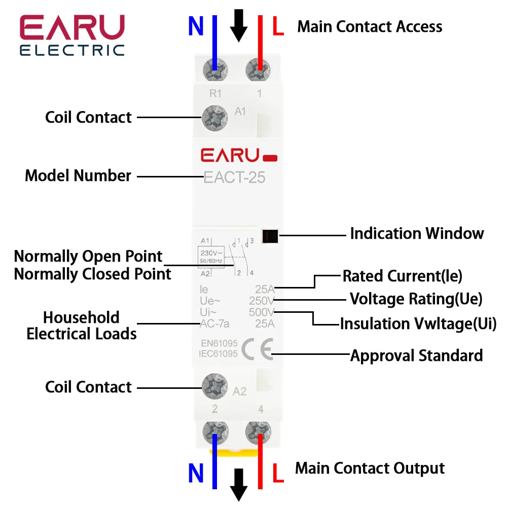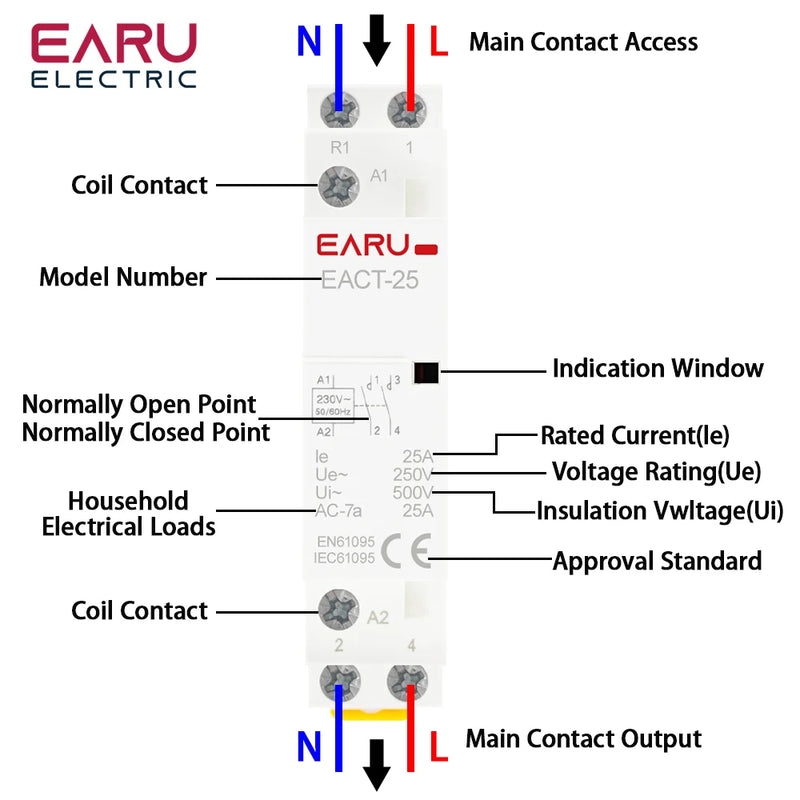 House hold AC contactor is mainly designed for AC 50Hz or 60Hz circuits with 230V .Rated operating voltage in AC7a usage ,rated operating voltage up to 230V, rated operating current up to 25A, Rated operating voltage in AC7b usage , rated current to 10A. Using in breaking capacity below 6kA circuit. For distance connect or break the circuit.