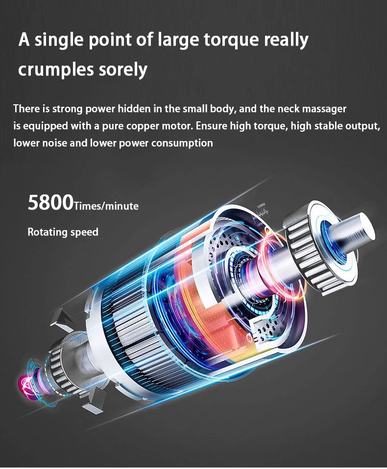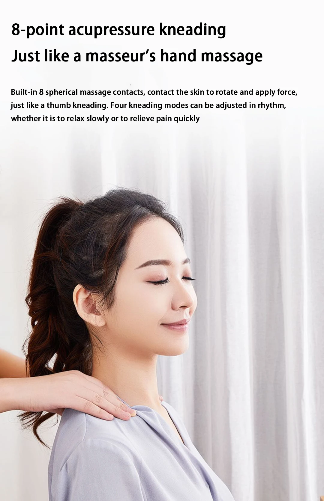 1. Brand new upgraded 4D massage products. All-round deep massage 2. Wireless design built-in 2600mAh battery. You can enjoy massage anytime, anywhere 3. Can be used for neck, shoulders, waist and legs to massage multiple parts 4. Red light irradiation and hot compresses can relieve stress, as comfortable as applying a hot towel, can promote blood circulation and reduce neck muscle stiffness 5. A spherical surface with a diameter of 15mm, imitating the contact form of the thumb, built-in 8 spherical massage contacts, which can contact the skin and generate strong rotation force for deep massage 6. Super torque, up to 5800 times per minute, ensuring high torque, low noise and low power consumption 7. Can knead 86 times per minute, four modes can be adjusted 8. Self-adaptive arc, built-in two surround directions, you can also switch at will during massage