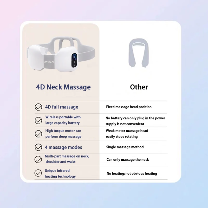 4D advantage 1.4D all-round massage. 2. There is a large capacity battery, wireless and portable 3. High torque motor can be used for deep massage 4.4 Massage method 5. Multi-part massage on neck, shoulders and waist can only massage the neck 6. Unique infrared light irradiation and heating technology Defects of the old model 1. Fixed massage head, small massage area 2. It can only be used with a wired plug power supply. Cannot be moved during use 3. The weak electric massage head easily stops rotating and cannot perform deep massage 4. Single massage 5. Massage only the neck 6. No heating/not obvious heating