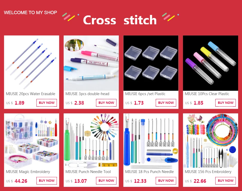 1 x thimble 1 x scissors 1 x tape measure  10 x punch needles 2 x needle threader 3 x cross stitch hoop 110 x embroidery floss 3 x punch needle handle 12 x plastic floss bobbins 12 x large eye sewing needles 1 x magic embroidery punch pen