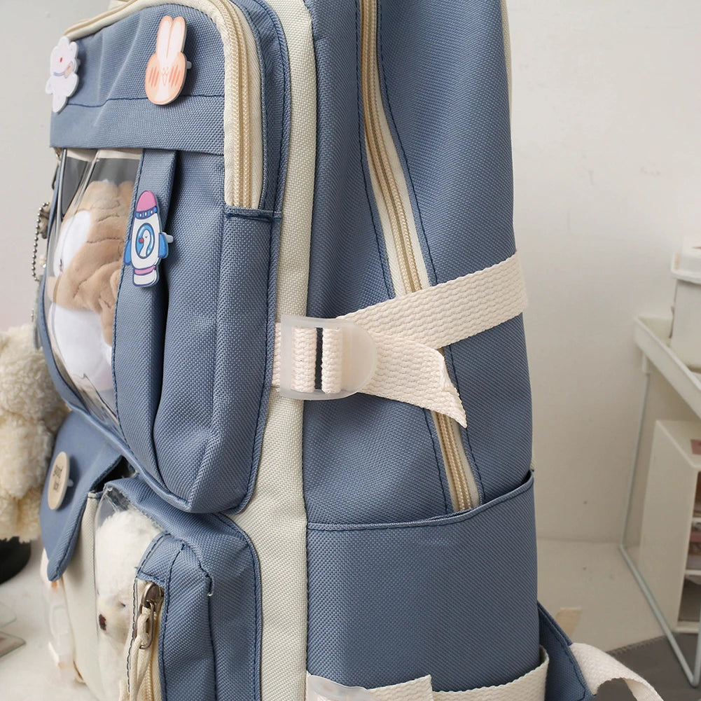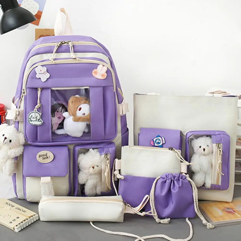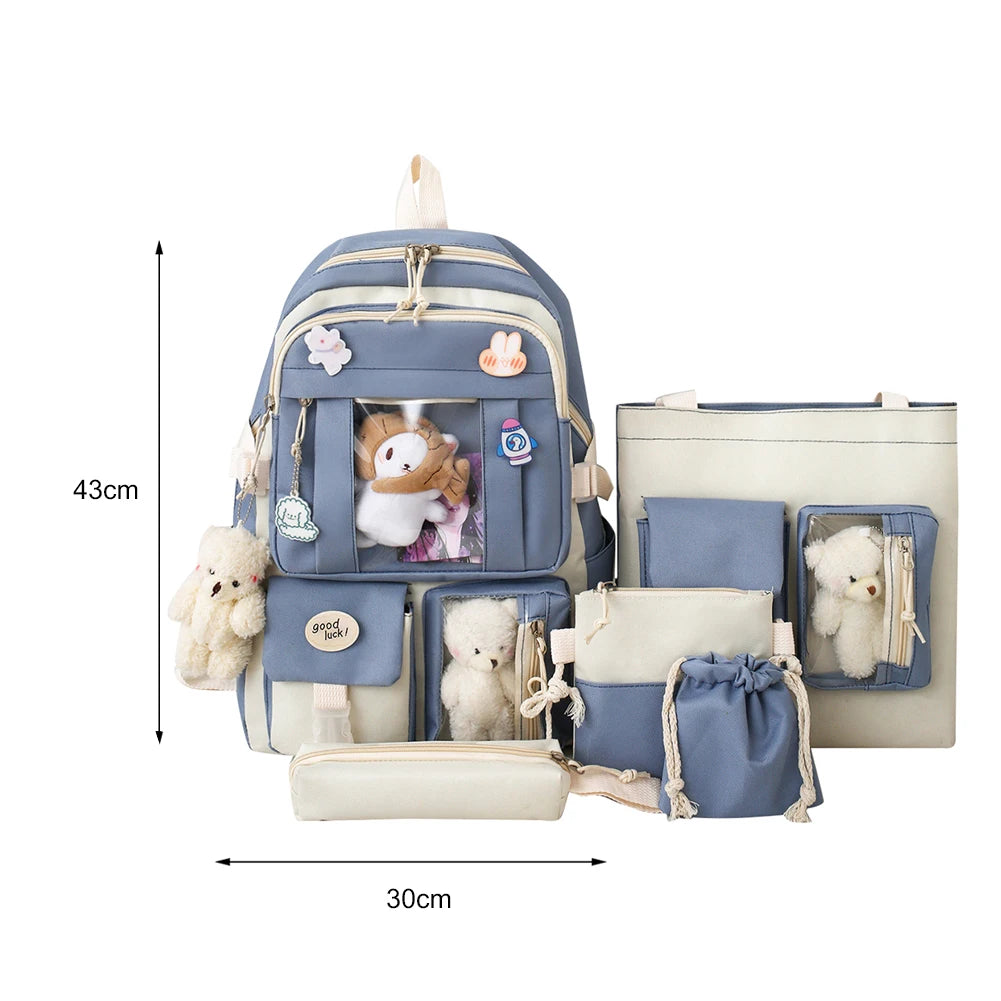 5pcs/set Canvas Kawaii Women Backpack Korean Cute Teenage Student Girl Large Capacity Schoolbag Clutch Travel Bookbags Shoulder Bags