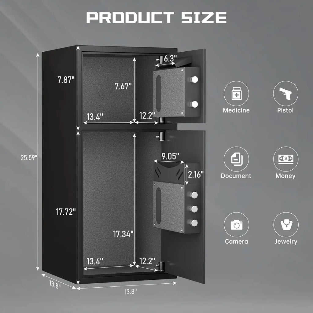 【Extra Large Safe】The spacious interior space allows you to store almost all valuable items. Interior dimensions 28.9"*13.4"*12.2". Ideal for storing cash, jewelry, gold, laptops, valuables, handguns, and ammunition. The double-layer large capacity design can meet the needs of the entire family.