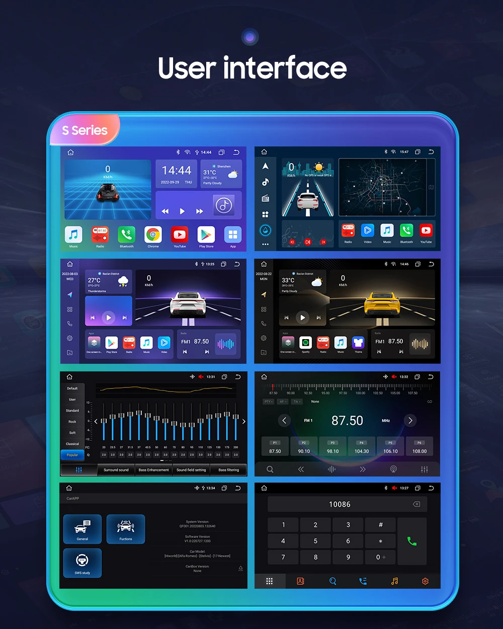 User interface: S Series(can set as 4 color type: Purple/ Dark blue / Black / Golden) included S8/ S7/ S6/ S5/ S4/ S3 version; and A Series included HC1 Carplay auto version.