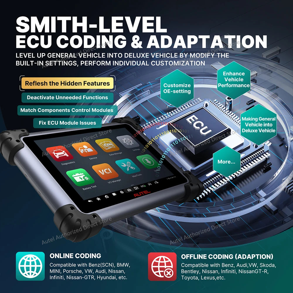 【Advanced ECU Coding】Autel Elite ii pro with advanced ECU coding functions, you are allowed to refresh modules like ECM, TCM, BCM etc for BMW/ BENZ/VW/ AUDI/ SKODA etc. You can also disable useless functions, unlock advanced functions. Autel Elite2 pro can directly pass-thru the gateway to access data for coding to improve vehicle fuel efficiency, reduce power loss, improve the durability of mechanical parts.
