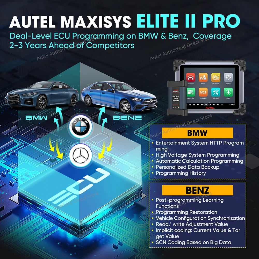 【ECU programming FOR BENZ & BMW】Same ECU Programming as Autel Ultra/ Ultra lite/ MS909/ MS919, Autel Elite II PRO car diagnostic scan tool can update/ replace existing software&firmware, reprogram new blank ECUs, reprogram second-hand ECUs, match components, refresh hidden functions, etc. It allows you into ECU inner execute "Programming➞Backup-Restroration"/ "Initial start up➞Control module replacement" process to renew/upgrade to latest vehicles software for Benz & BMW.