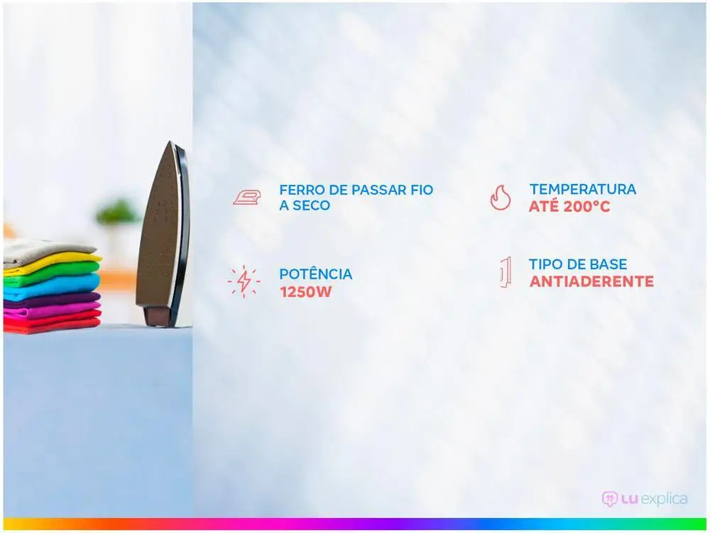 The electric dry iron of Britania BFS30 has 1250W of power and heats up a lot and quickly, providing much more efficiency when it comes to ironing your clothes. Because it has heating in 26 seconds, you have a lot of agility to iron the clothes without delays. In addition, it has 5 temperatures, so you can select the ideal for each type of fabric, keeping care with the clothes. The non-stick base ensures the distribution of heat evenly and quickly, preventing the clothes from sticking to the iron. The cord with 1.7 m and 360 ° provides greater freedom of movement during use. Not to mention the save buttons, which protects the buttons of clothes during the use of the iron. It reaches a maximum temperature of 200 °C, available in white, is the ideal choice for those looking for practicality and efficiency when ironing clothes.