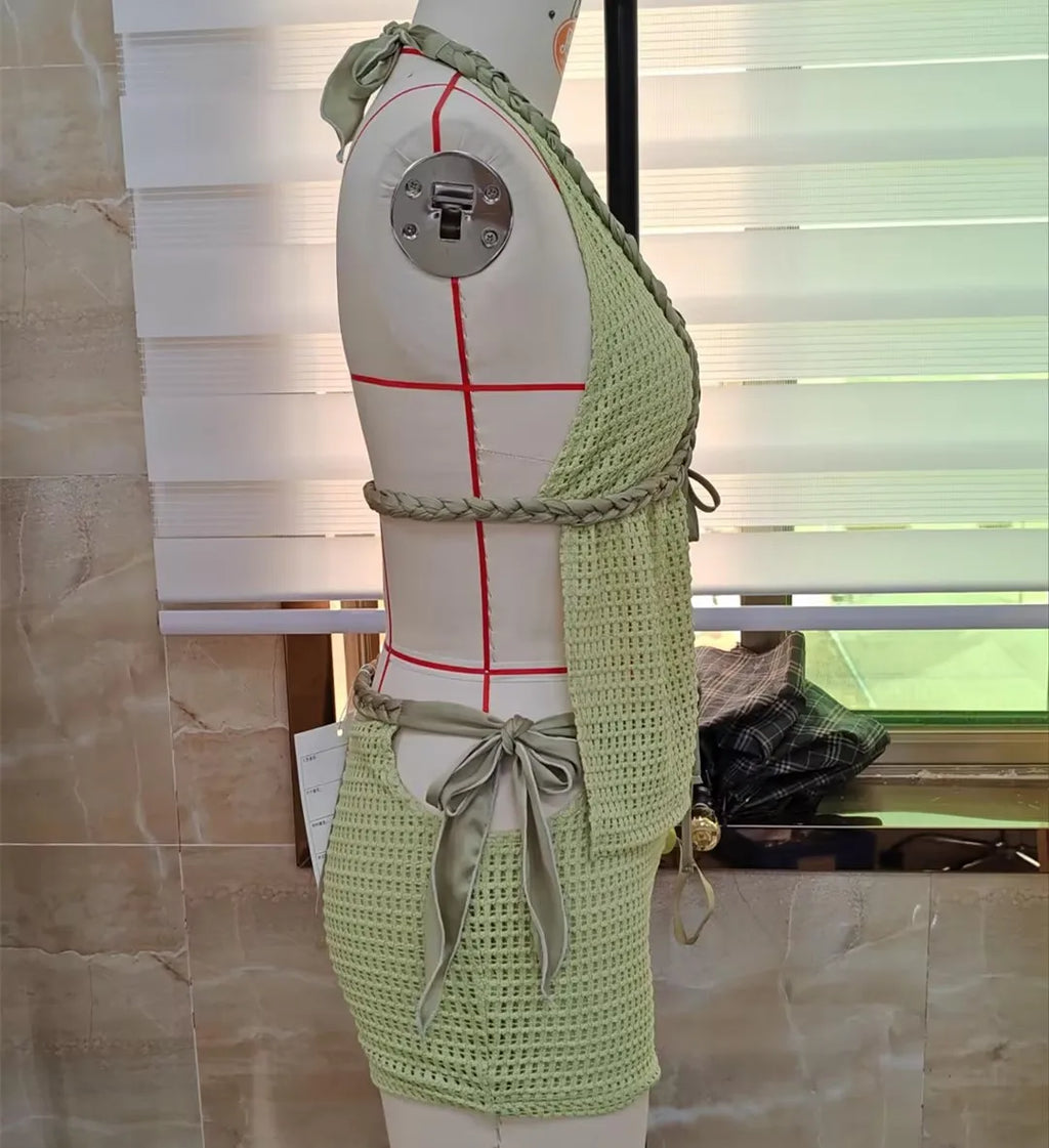 hirigin Summer Two Piece Crochet Set for Women Tie Up Halter Open Back Split Cami Tank Top Hollow Out Shorts Beachwear