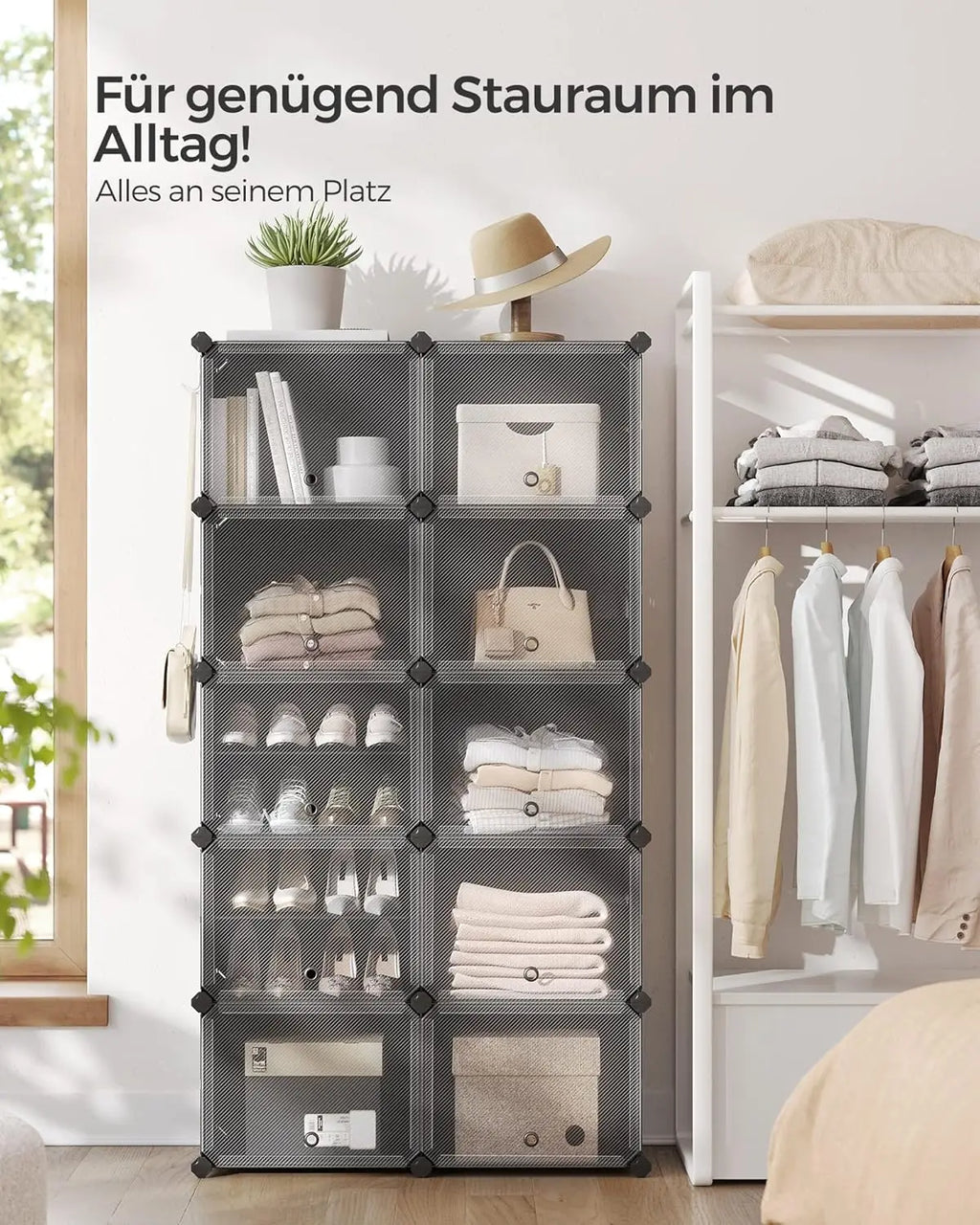 • [Easy care & well ventilated] The shelving system with transparent doors is dust and waterproof and easy to clean with a damp cloth; the eyelet in each door serves both as a handle and for ventilation to avoid unpleasant odors