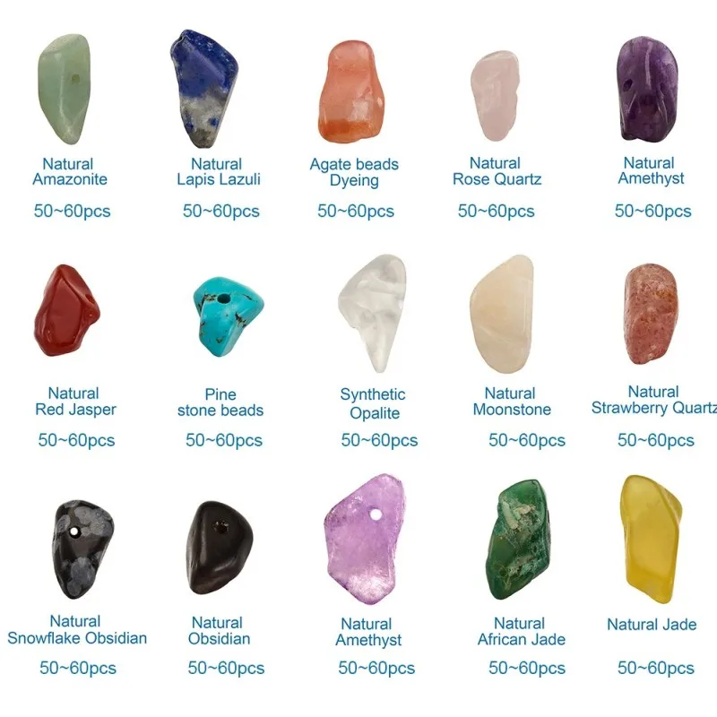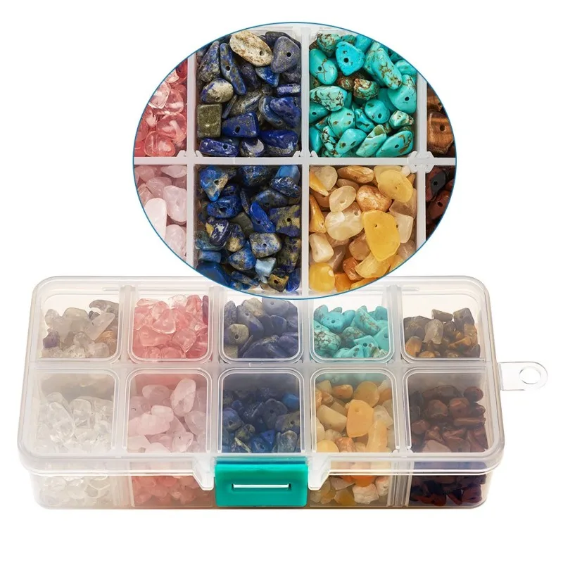 Beads: 4~10x4~6x2~4mm, hole: 1mm, 10material, about 100pcs/material, 1000pcs/box;