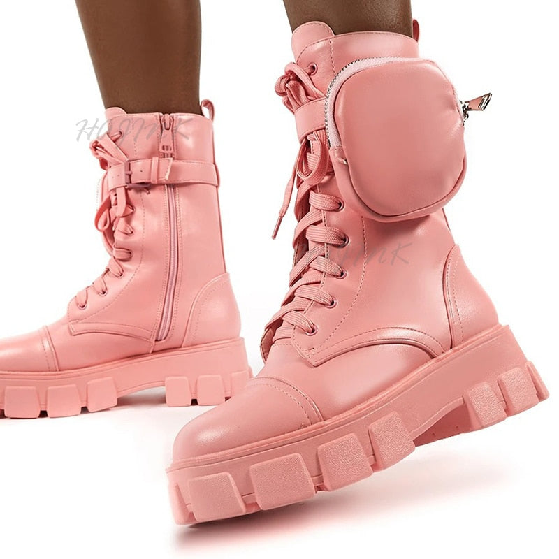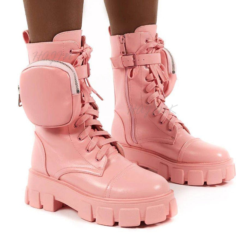 Women Boots 2020 Fashion Chunky Boots Pocket Platform Boots White Shoes For Women Autumn Winter Boots High Heels Botas Mujer