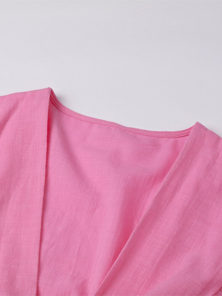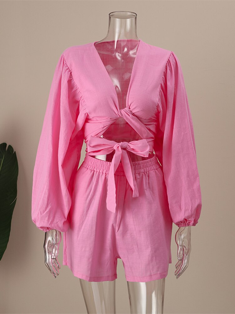 Women Casual Loose V Neck Crop Top And Straight Shorts Two Piece Set Female Solid Lace Up Long Sleeve Shirts Tops And Shorts Set