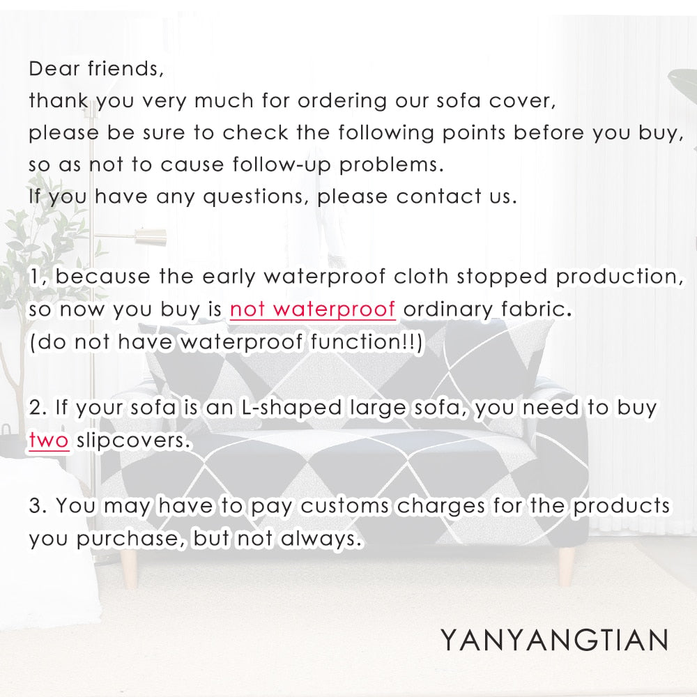 Thank you very much for ordering our sofa cover,please be sure to check the following points before you buy so as not to cause follow-up problems.