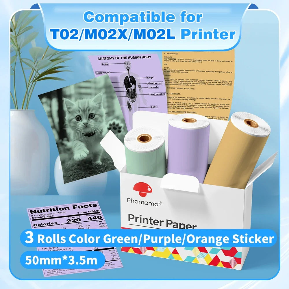 3 Rolls Phomemo White Sticker Paper Thermal Label for T02 M02L Portabal Mini Printer Keep for 10 Years Sticky Paper 50mm/53mm