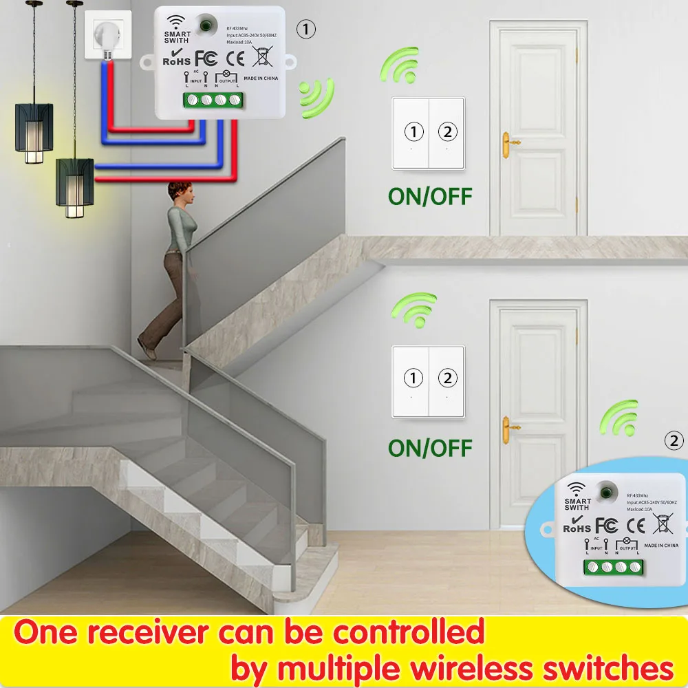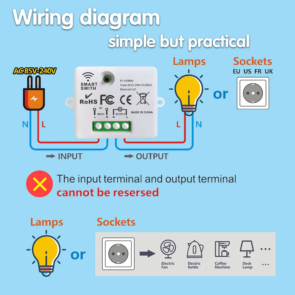6.This receiver adopts 10A high-quality relay that can be used over 100,000 times. The receiver is suitable for AC 85V~250V voltage, so AC 240V/220V/ 230V/110V voltage can working well.