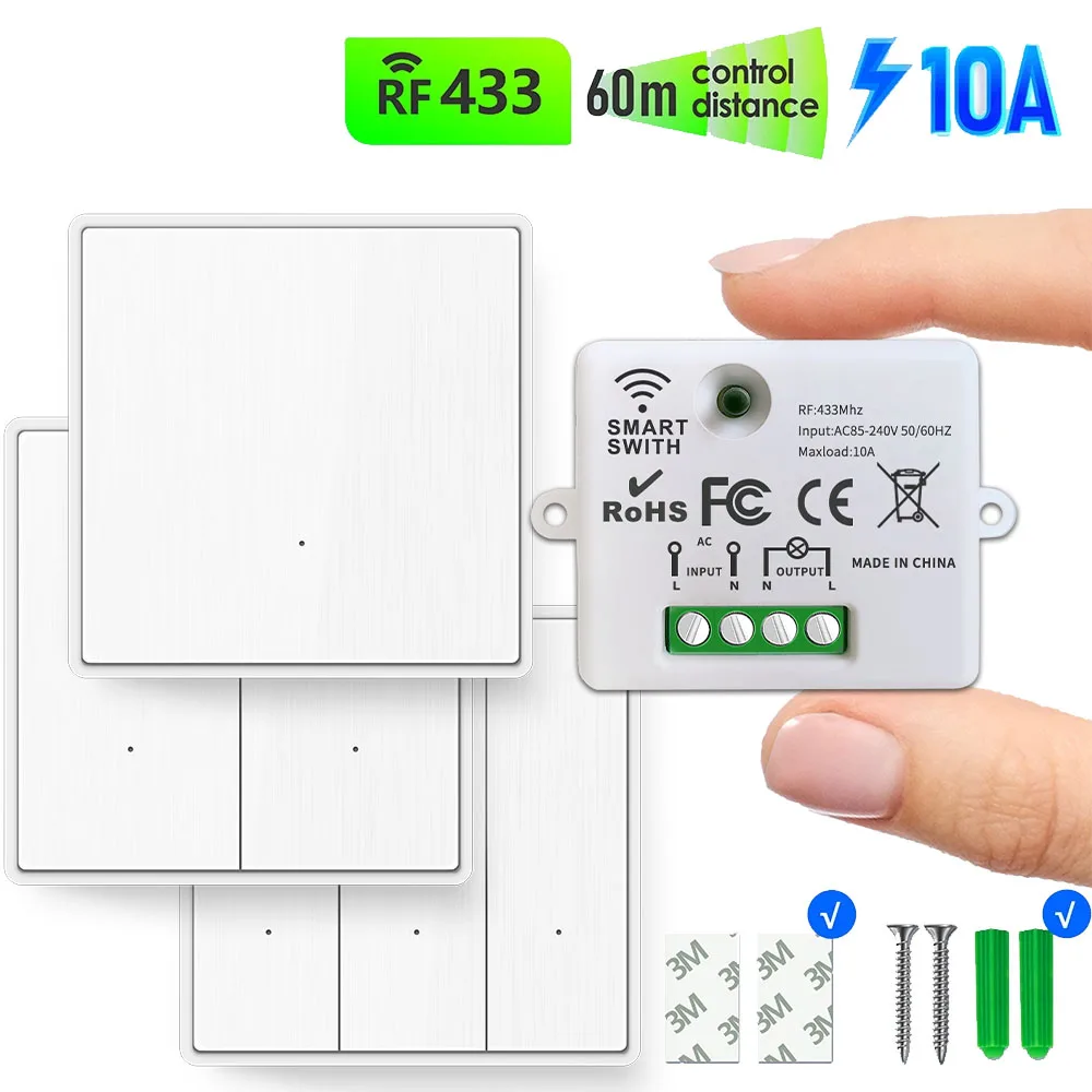 433MHz Universal Remote Control Switch AC 90-250V 10A 1Ch Receiver With Push Button Wireless Wall Switch Panel For Light Lamp